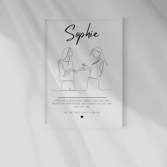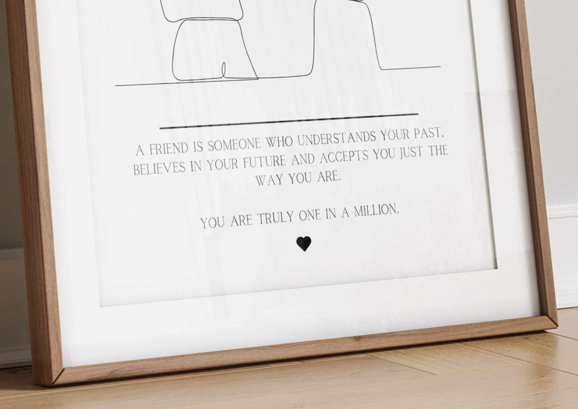 This beautiful friendship line art print is the perfect gift to give to your friend to showcase how special they are. Personalised with their name and a beautiful quote that reads 'A friend is someone who understands your past, believes in your future and accepts you just the way you are. You are truly one in a million.'