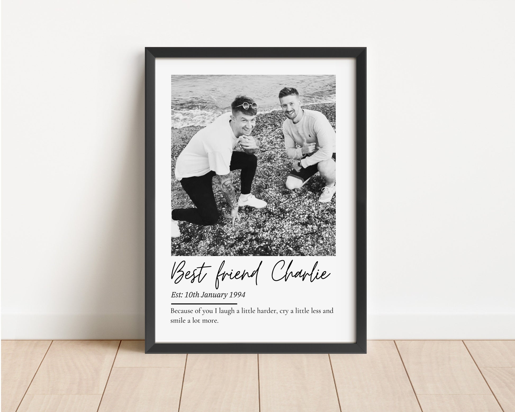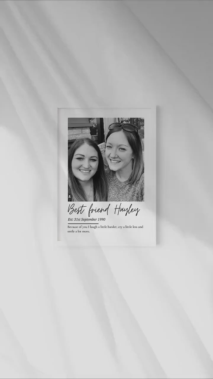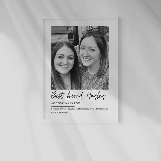 Treat your incredible bestie with this sentimental and beautiful customised friendship print. Fully personalised to order with a photo that captures their wonderful relationship, their name and year established date finished off with a quote that reads 'Because of you I laugh a little harder, cry a little less and smile a lot more.'