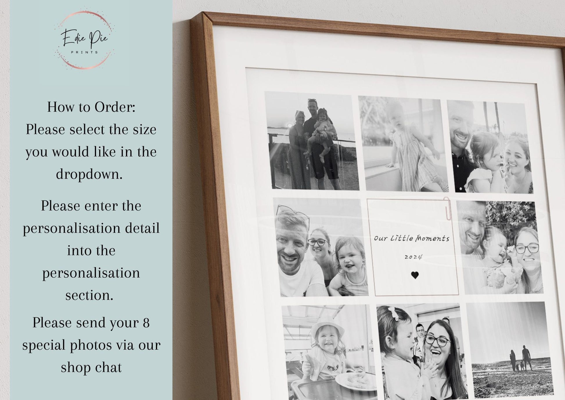 Once ordered please enter the information required within the personalisation section and send the photo's required to us directly via Etsy.