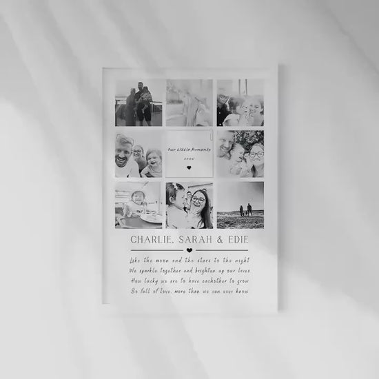 This stunning family gift print is the ideal present for any special occasion for any special people within your lives. Capturing 8 crisp photos of your choosing surrounding the wording 'Our little moments' with the year you would like to add. Underneath these stunning photos is the name of the individuals and a quote that reads 'Like the moon and the stars at night, we sparkle together and brighten up our lives, how lucky we are to have each other to grow, so full of love, more than we will ever know.'