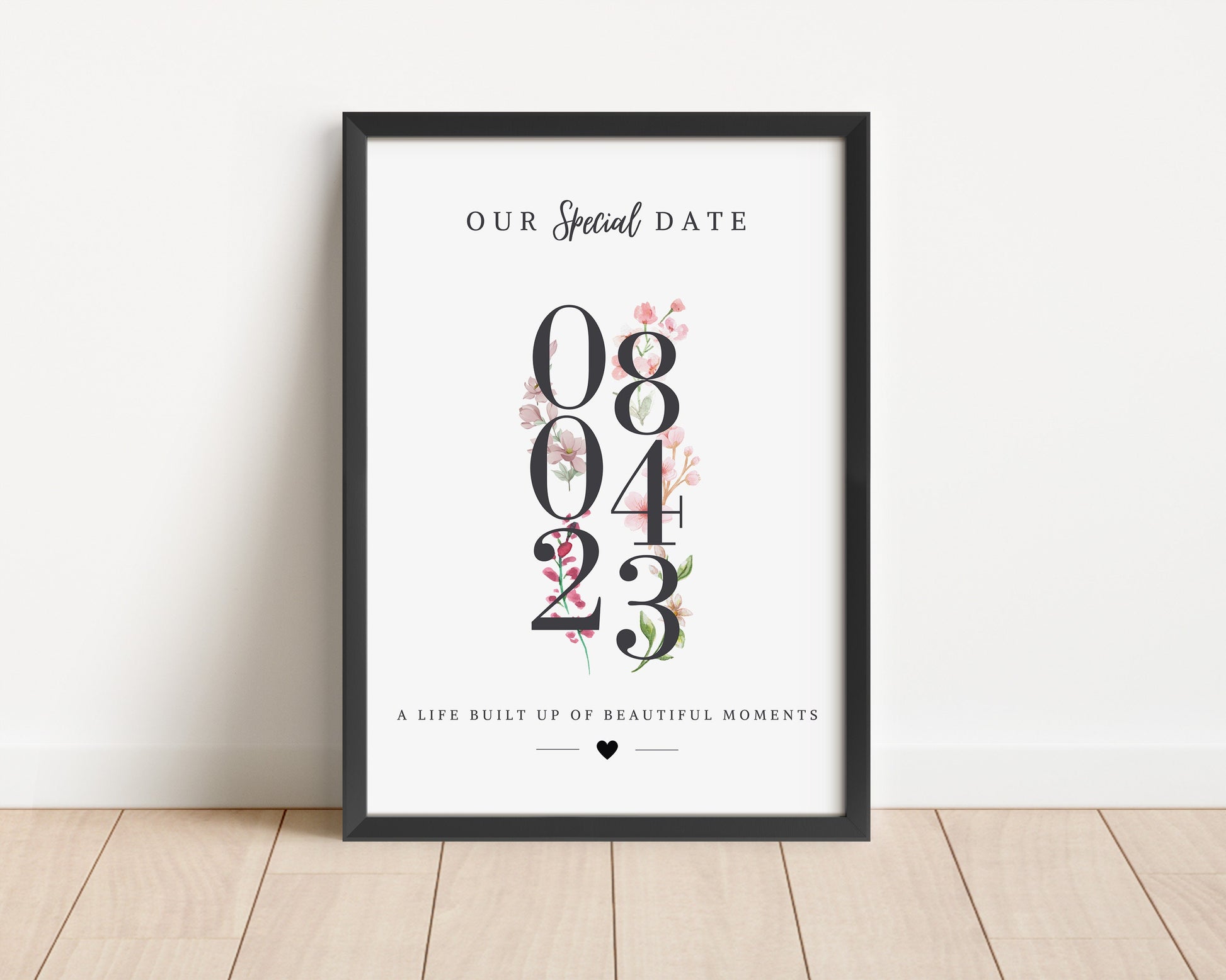 Custom Floral Anniversary Date Print: Birthday Gift for Partner Wife, Framed Date Poster