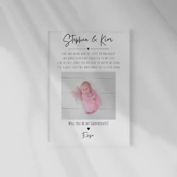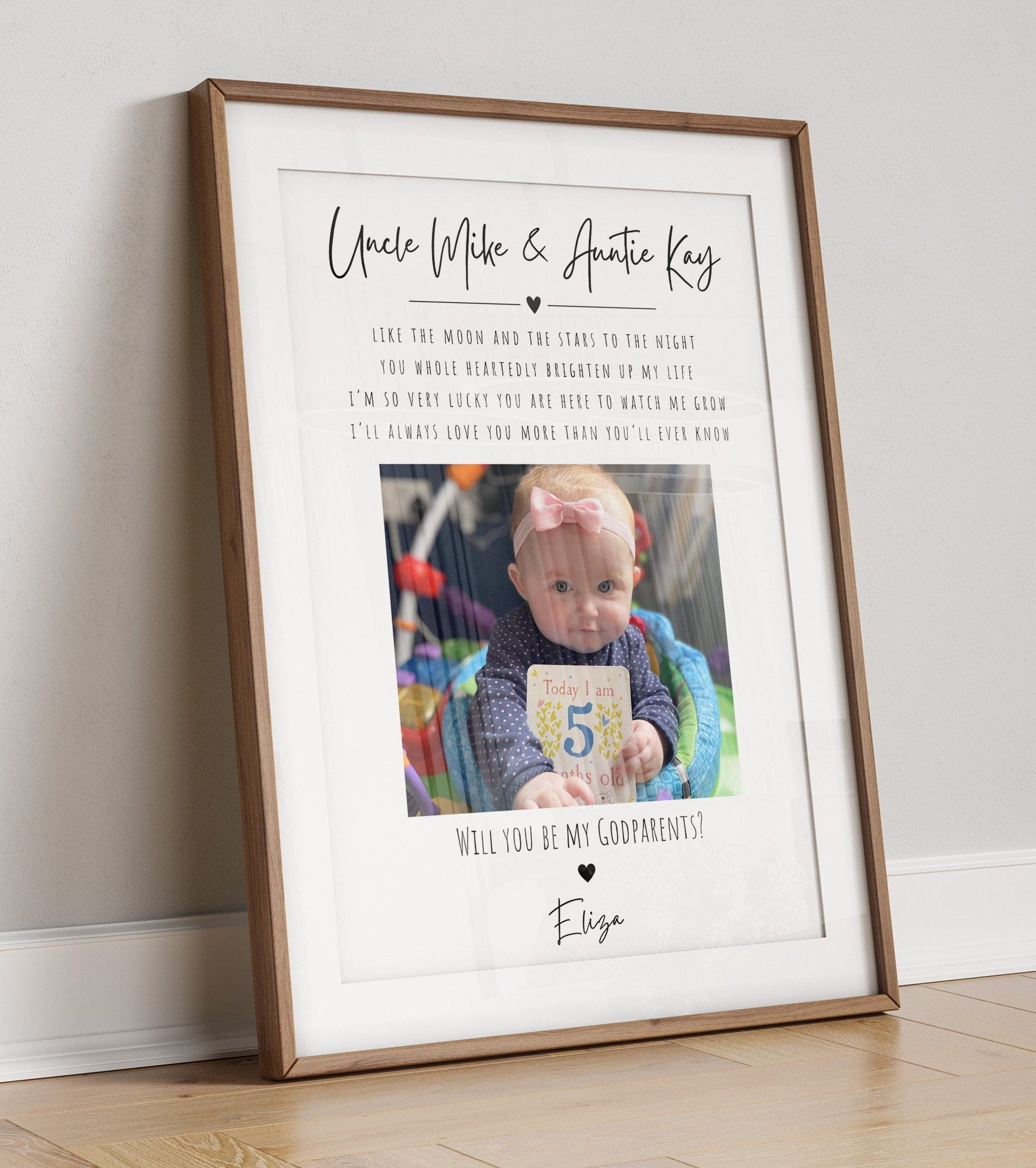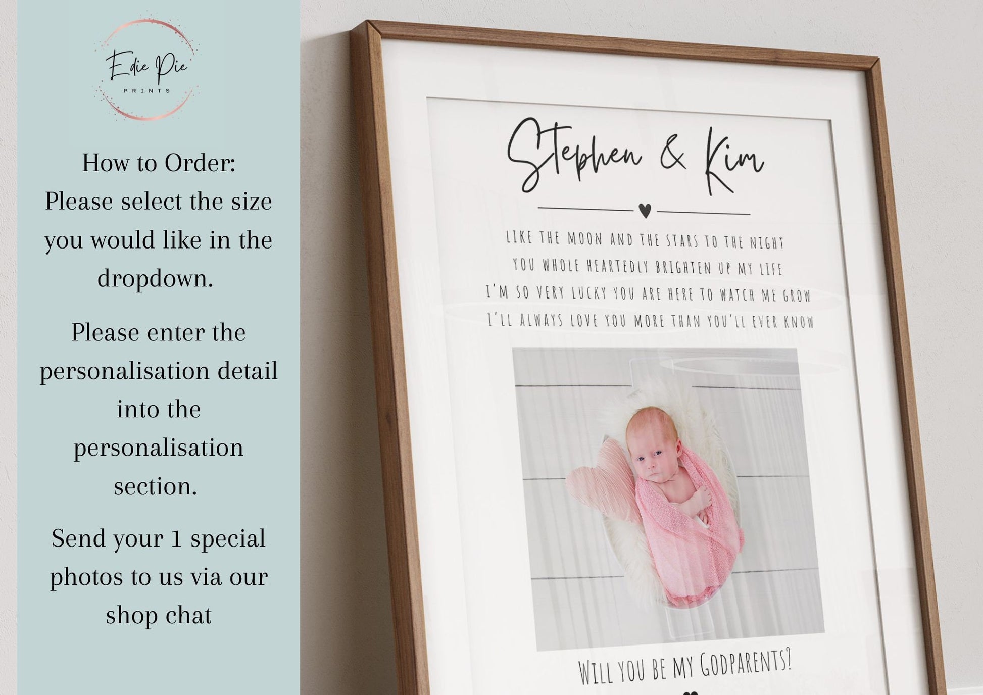 Treat some incredible Godparents to be with this sentimental and beautiful customised print. Fully personalised to order with a photo that captures their wonderful relationship, their name and a beautiful quote that reads 'Like the moon and the stars to the night, you whole heartedly brighten up my life, i'm so very lucky you are here to watch me grow, i'll always love you more than you'll ever know. Will you be my Godparents?'