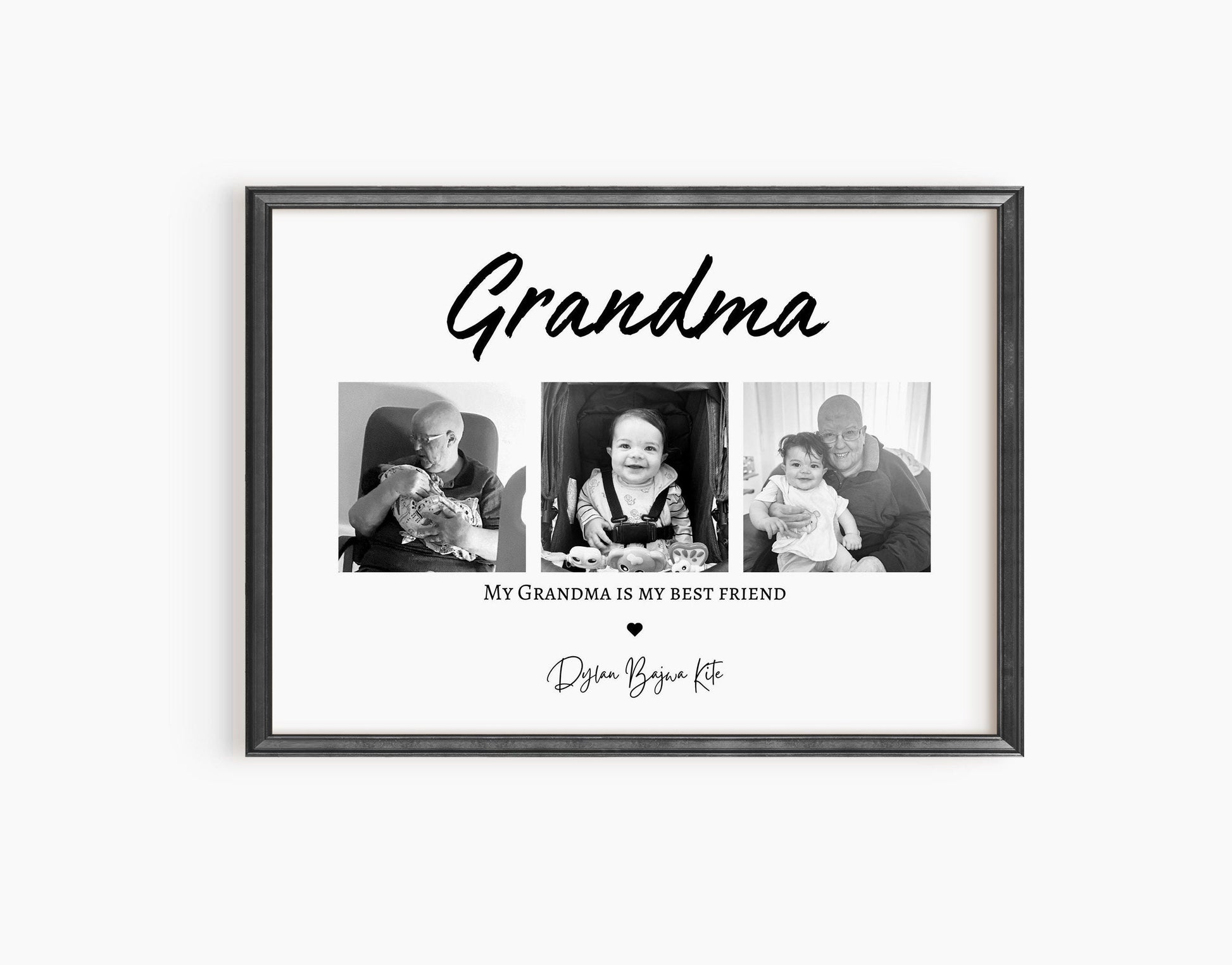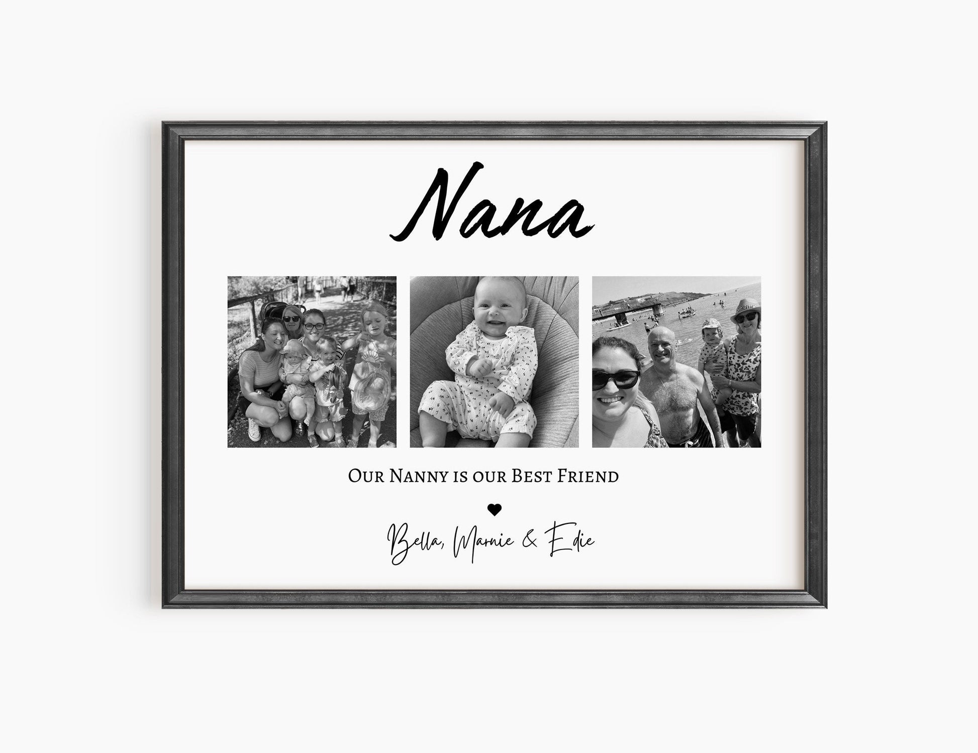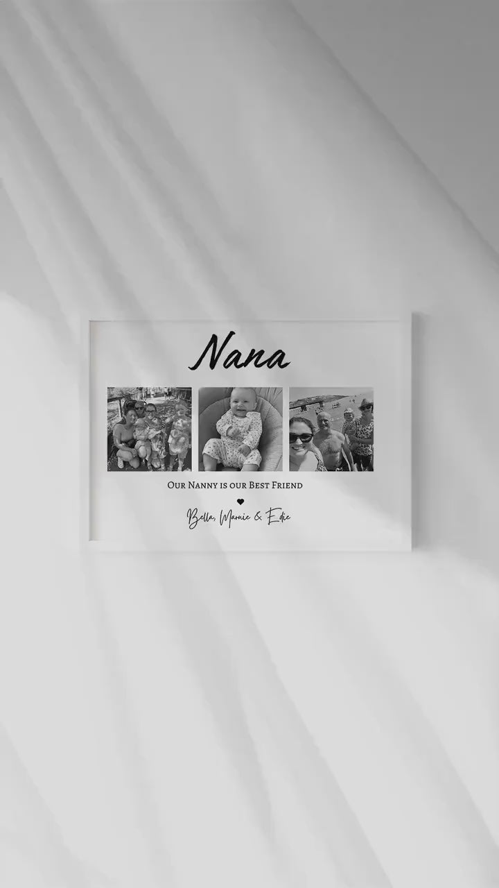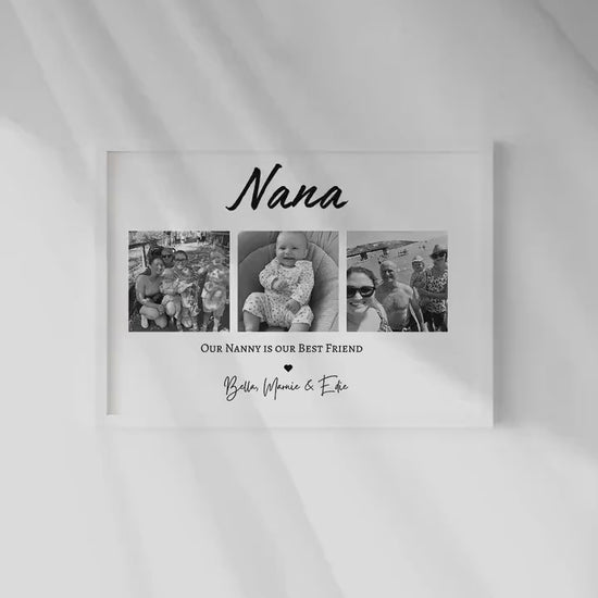 Treat an incredible Nana with this sentimental and beautiful customised photo print. Fully personalised to order with photos that capture the wonderful relationship with the Nanny, Gran, Granny, Grandma or Nana, the children/s name and a quote that reads 'My/ our Nanny is my/ our Best Friend.'