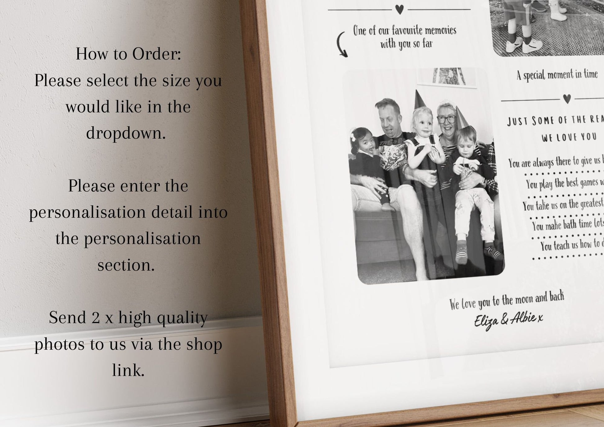 Treat an incredible Nanny with this sentimental and beautiful customised photo print. Fully personalised to order with photos that capture the wonderful relationship between an amazing Nana and her Grandson and or Granddaughter. This stunning poster captures 2 gorgeous photos with a wonderful quote, five reasons the child or children love their Gran, Nan or whatever your prefered title is and a sign off for the child or children.