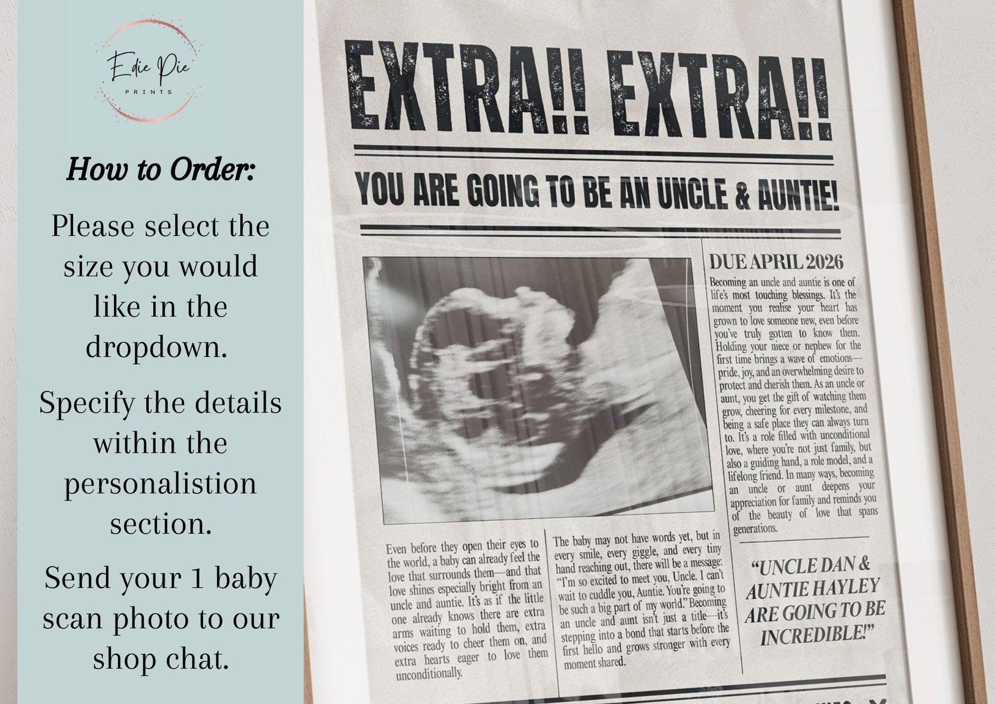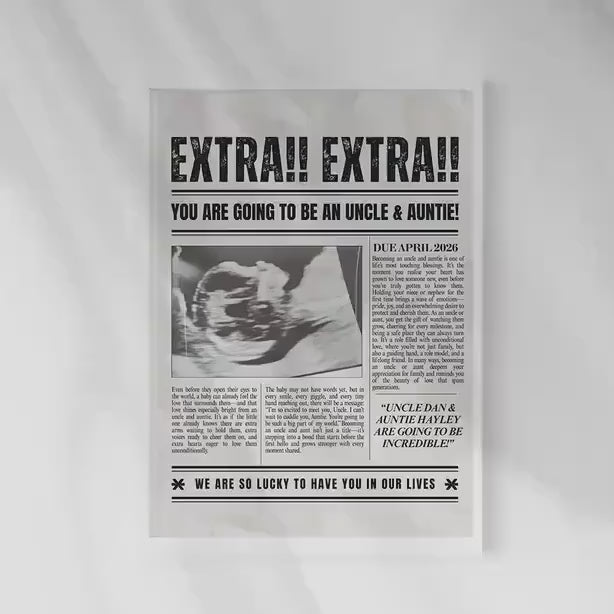 Announce your exciting news in a creative and heartfelt way with this custom newspaper-style pregnancy announcement. This personalised print is designed to surprise soon-to-be uncles and aunties with a one-of-a-kind keepsake featuring your baby's ultrasound, due date, and custom names.