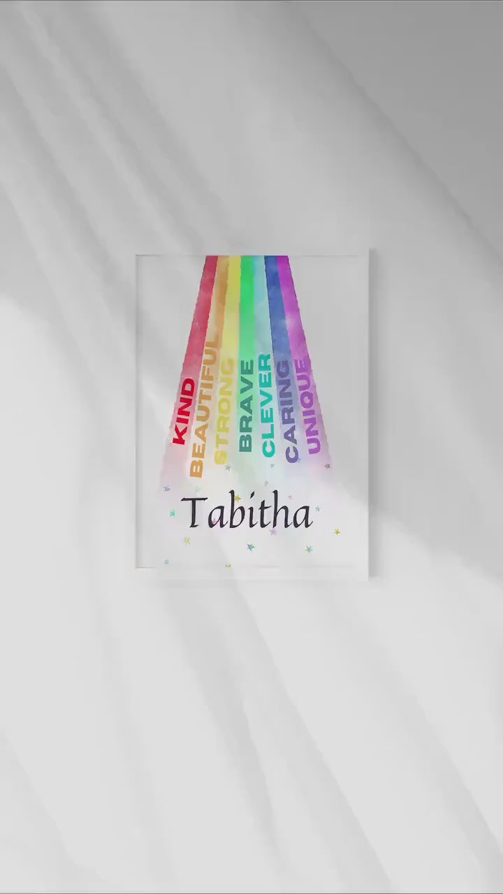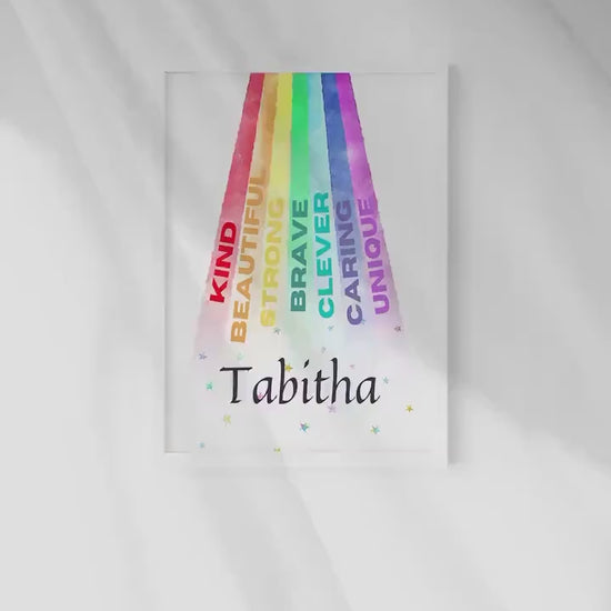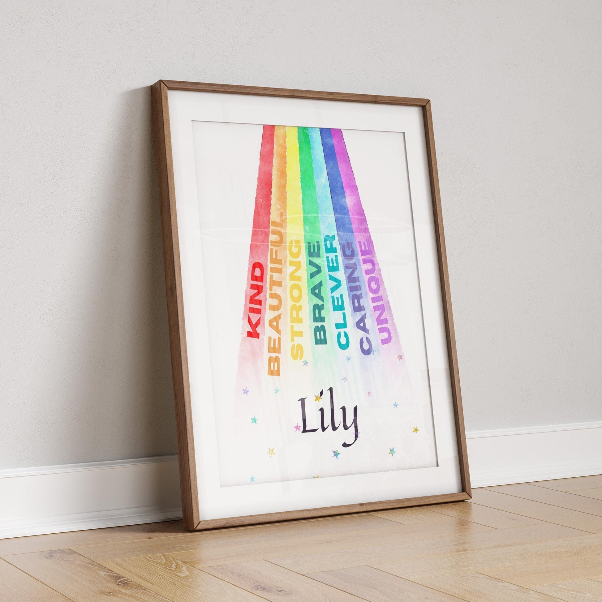 Capture your child's uniqueness with this personalised rainbow name print featuring the name and inspiring qualities: Kind, Beautiful, Strong, Brave, Clever, Caring, and Unique. Printed in vibrant watercolor tones, this custom wall art is perfect for a nursery, girls' bedroom, or as a thoughtful birthday or baby shower gift. Designed to encourage self-esteem and positivity, this high-quality print adds a colorful and meaningful touch to any space. Framed or unframed options available. Custom names can be requested to create your own unique version.