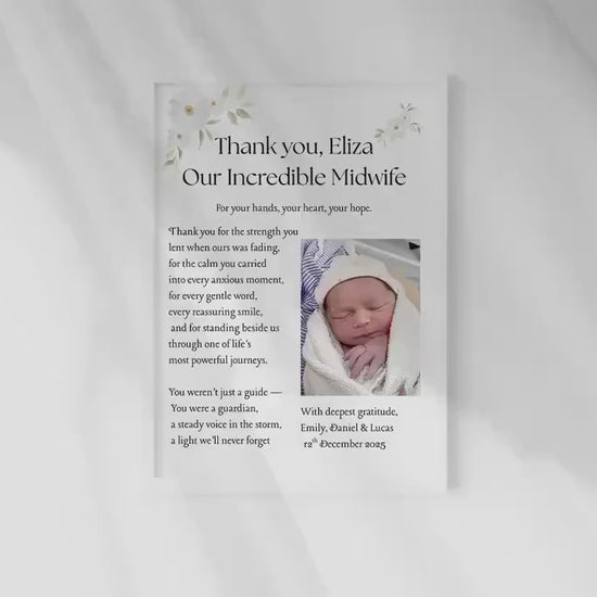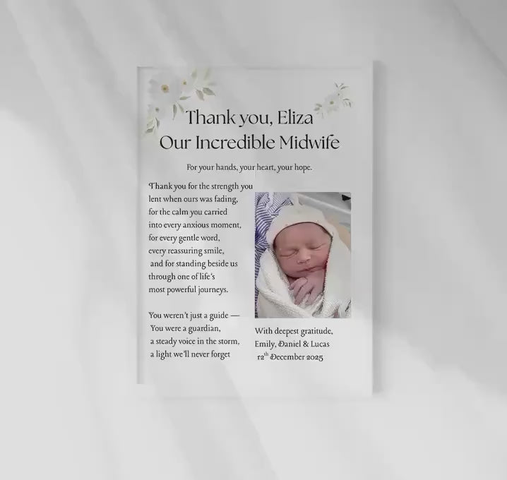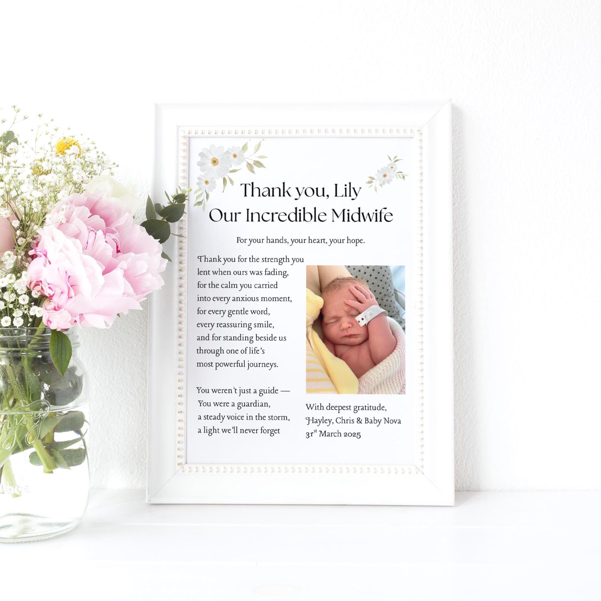 This elegant Midwife thank you print is a heartfelt way to honor the midwife who supported your birth journey with strength, compassion, and care. Featuring a beautifully written message, delicate floral accents, and a space to insert your baby's photo, this keepsake makes the perfect gift to show your deepest gratitude.