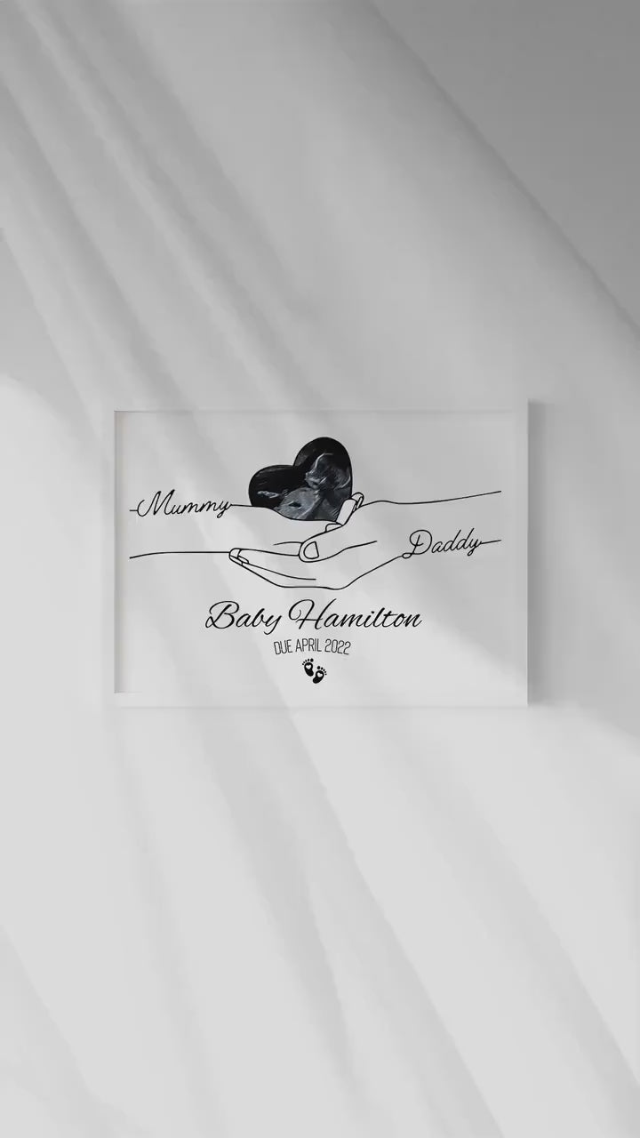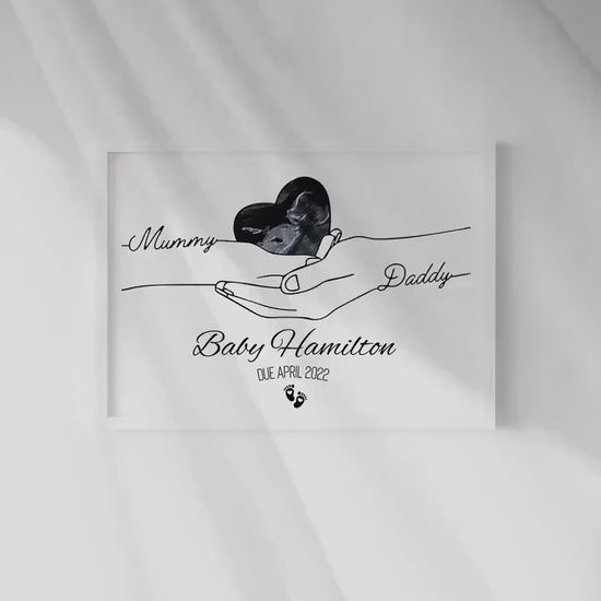 Celebrate the joy of new life with this beautifully personalized pregnancy ultrasound print. Featuring a minimalist line-art design of "Mummy" and "Daddy" hands gently holding a heart-shaped ultrasound photo, this artwork makes a meaningful keepsake for expecting parents.