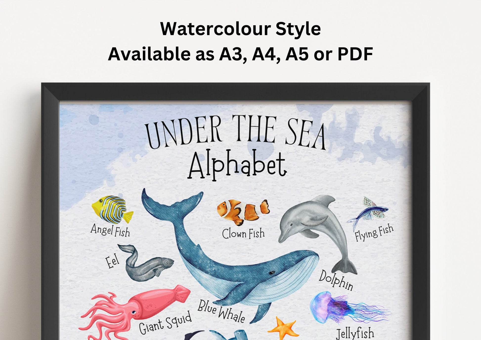 Ocean Alphabet Poster: Watercolour Sea Animals Nursery Art Print