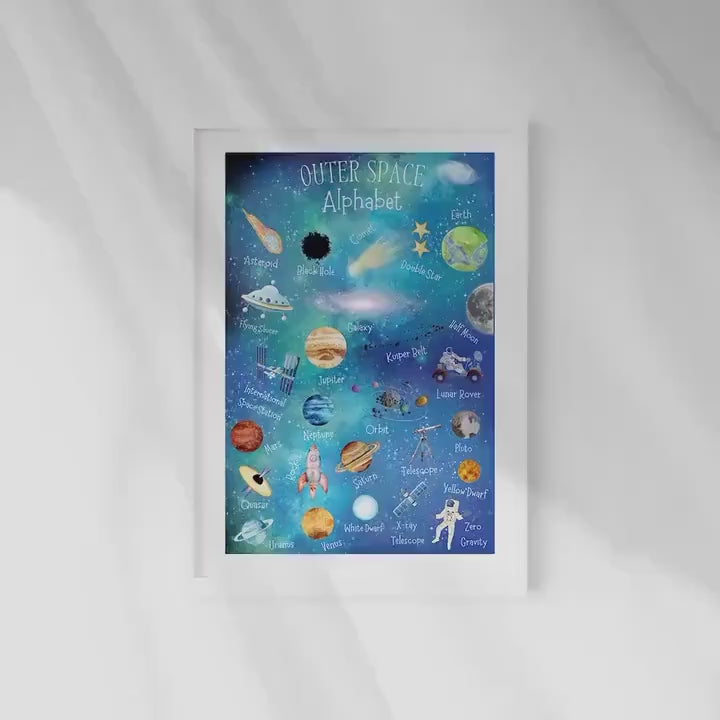This beautifully coloured Outer Space Alphabet Print is the perfect decor for your little one's Space themed nursery or bedroom. With stunning planets, rockets, atronauts and more. This print can come as part of a set also. Just check out our shop page to see more. In a beautiful watercolour style on premium 220gsm photo card with free uk delivery. This truly is the perfect finishing touch for a special space within your home.