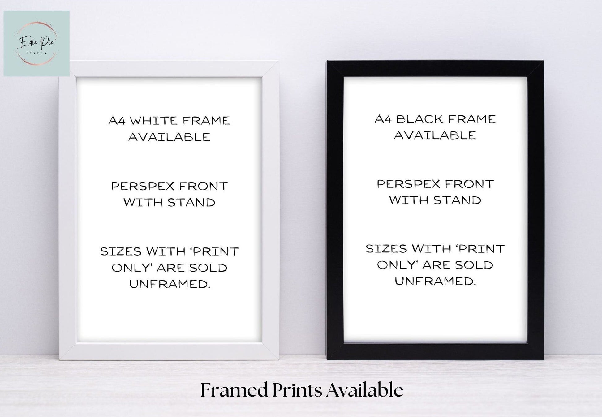 We now have A4 framed options available in clean black or white surround with a lovely perspex front. This is a beautiful finish for all of our stunning designs making the perfect gift for all occasions.