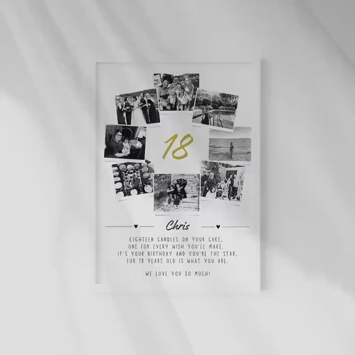 Celebrate a wonderful 18th birthday with this stunning photo collage print capturing 8 stunning photos and a gorgeous quote that reads 'Eighteen candles on your cake, one for every wish you'll make. It's your birthday and you're the star, for 18 years old is what you are.' This quote can be changed upon request.