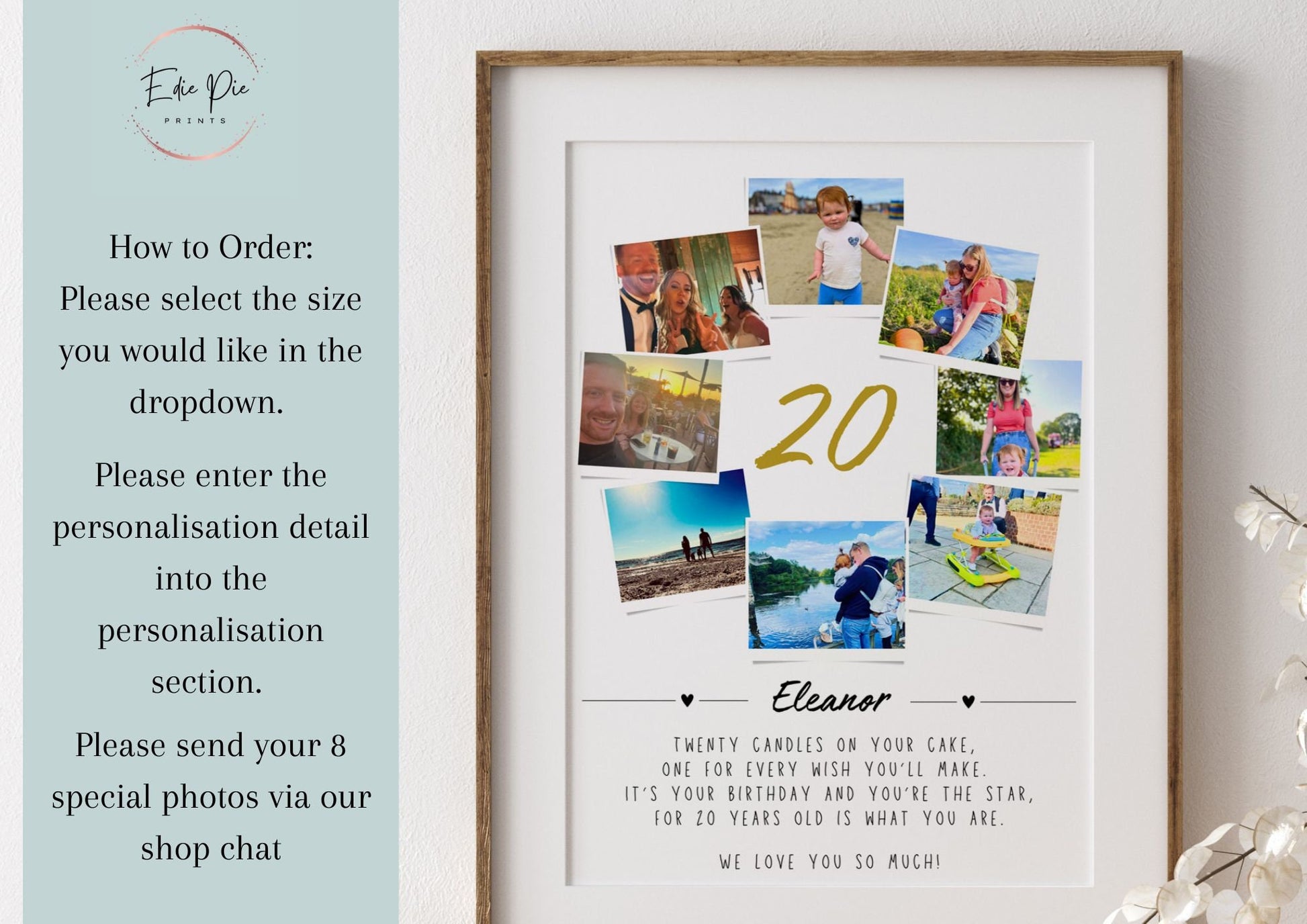 Celebrate a wonderful 20th birthday with this stunning photo collage print capturing 8 stunning photos and a gorgeous quote that reads 'Twenty candles on your cake, one for every wish you'll make. It's your birthday and you're the star, for 20 years old is what you are.' This quote can be changed upon request.