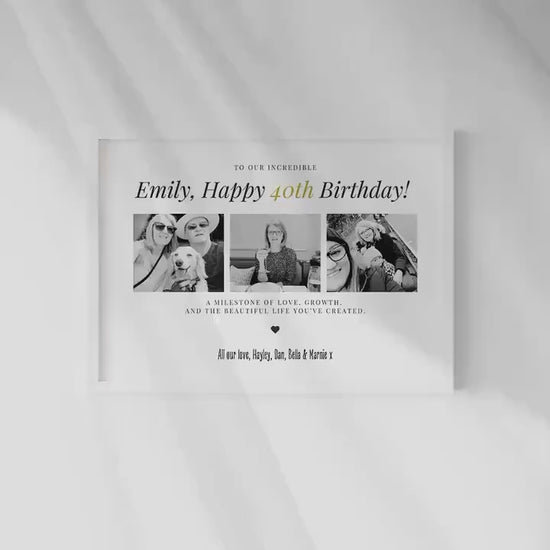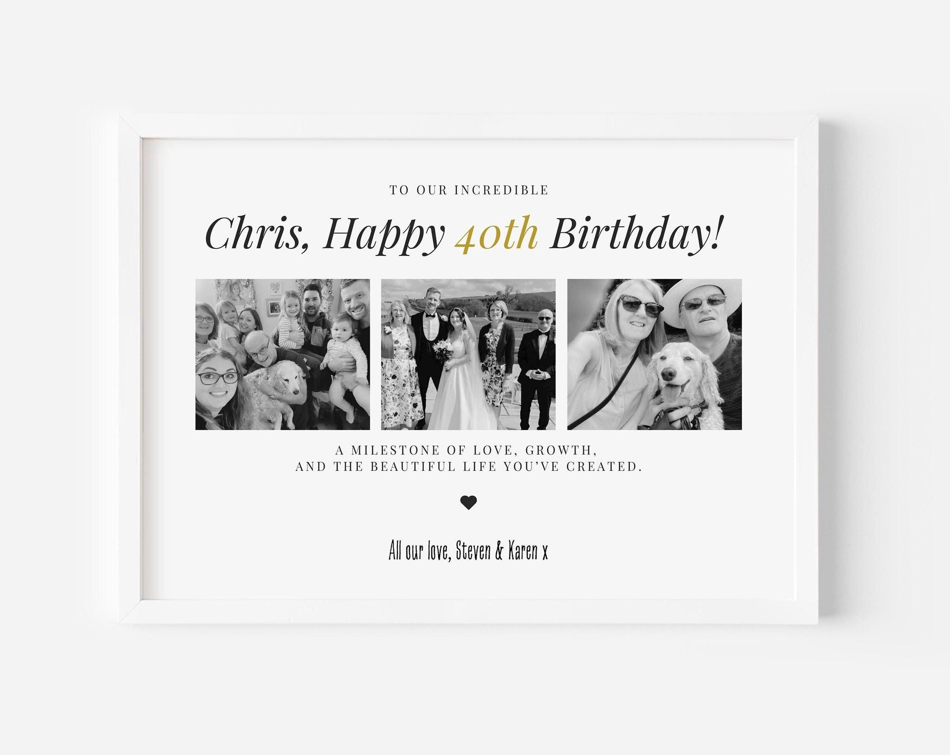 A beautiful gift capturing a wonderful 40th birthday recipient with this stunning photo print capturing 3 stunning photos and a gorgeous quote that reads 'A milestone of love, growth, and the beautiful life you've created.' This quote can be changed upon request. This is a stunning gift for your son, daughter or friend who are celebrating their 40th Birthday. A lovely keepsake to remember that special moment in time. We now have A4 framed options available in clean black or white surround with a lovely perspex front. This is a beautiful finish for all of our stunning designs making the perfect gift for all occasions.