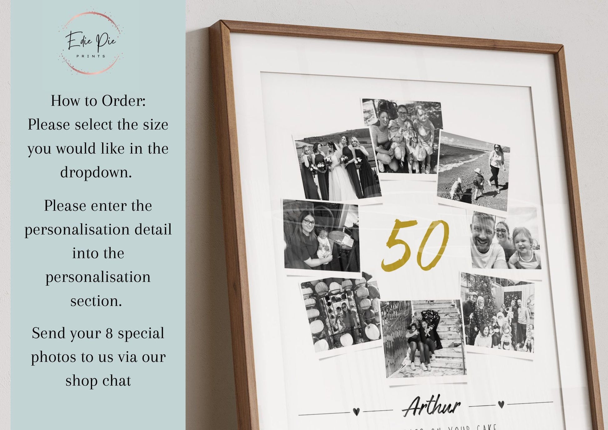 Celebrate a wonderful 50th birthday with this stunning photo collage print capturing 8 stunning photos and a gorgeous quote that reads 'Fifty candles on your cake, one for every wish you'll make. It's your birthday and you're the star, for 50 years old is what you are.' This quote can be changed upon request. This is a stunning gift for your son, daughter or friend who are celebrating their 50th Birthday. A lovely keepsake to remember that special moment in time.