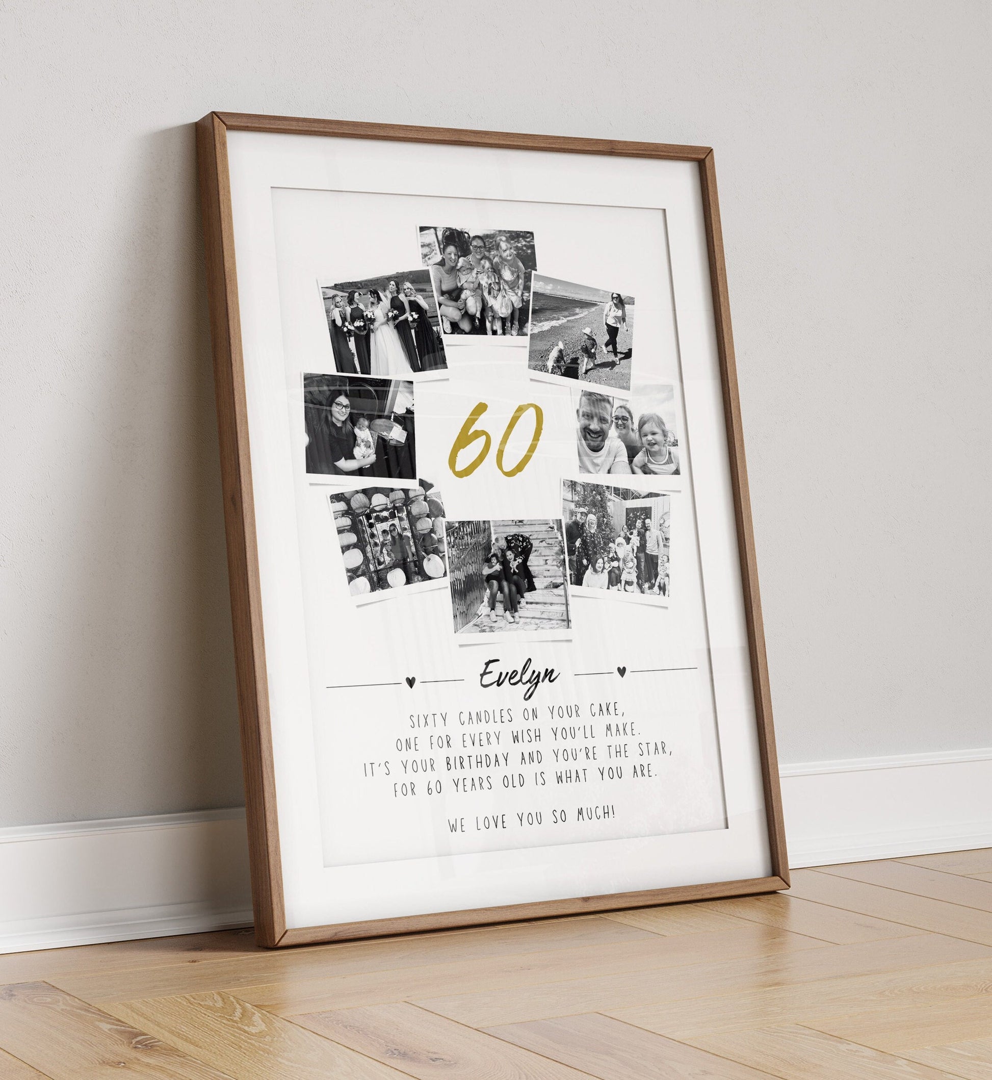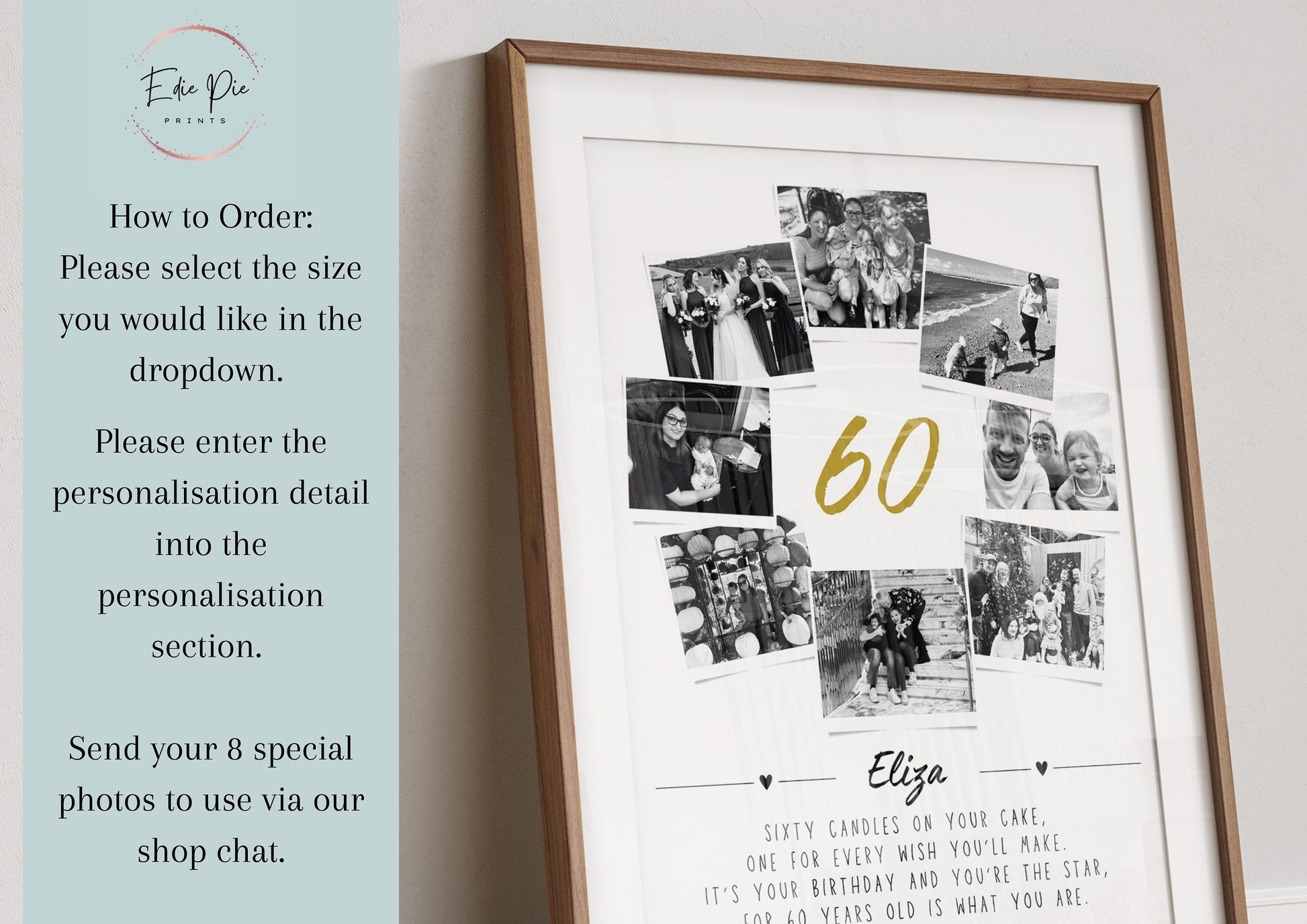 Celebrate a wonderful 60th birthday with this stunning photo collage print capturing 8 stunning photos and a gorgeous quote that reads 'Sixty candles on your cake, one for every wish you'll make. It's your birthday and you're the star, for 60 years old is what you are.'
