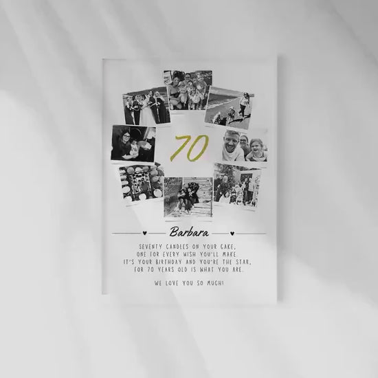 Celebrate a wonderful 70th birthday with this stunning photo collage print capturing 8 stunning photos and a gorgeous quote that reads 'Seventy candles on your cake, one for every wish you'll make. It's your birthday and you're the star, for 70 years old is what you are.' This quote can be changed upon request.
