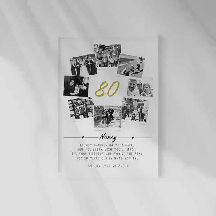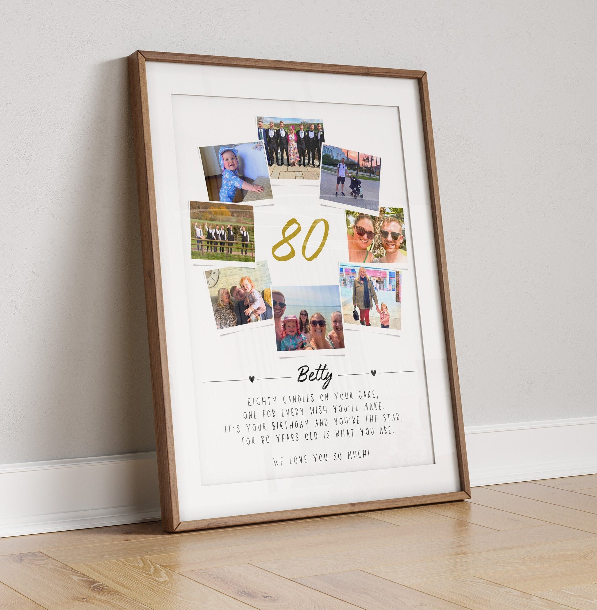 Celebrate a wonderful 80th birthday with this stunning photo collage print capturing 8 stunning photos and a gorgeous quote that reads 'Eighty candles on your cake, one for every wish you'll make. It's your birthday and you're the star, for 80 years old is what you are.'