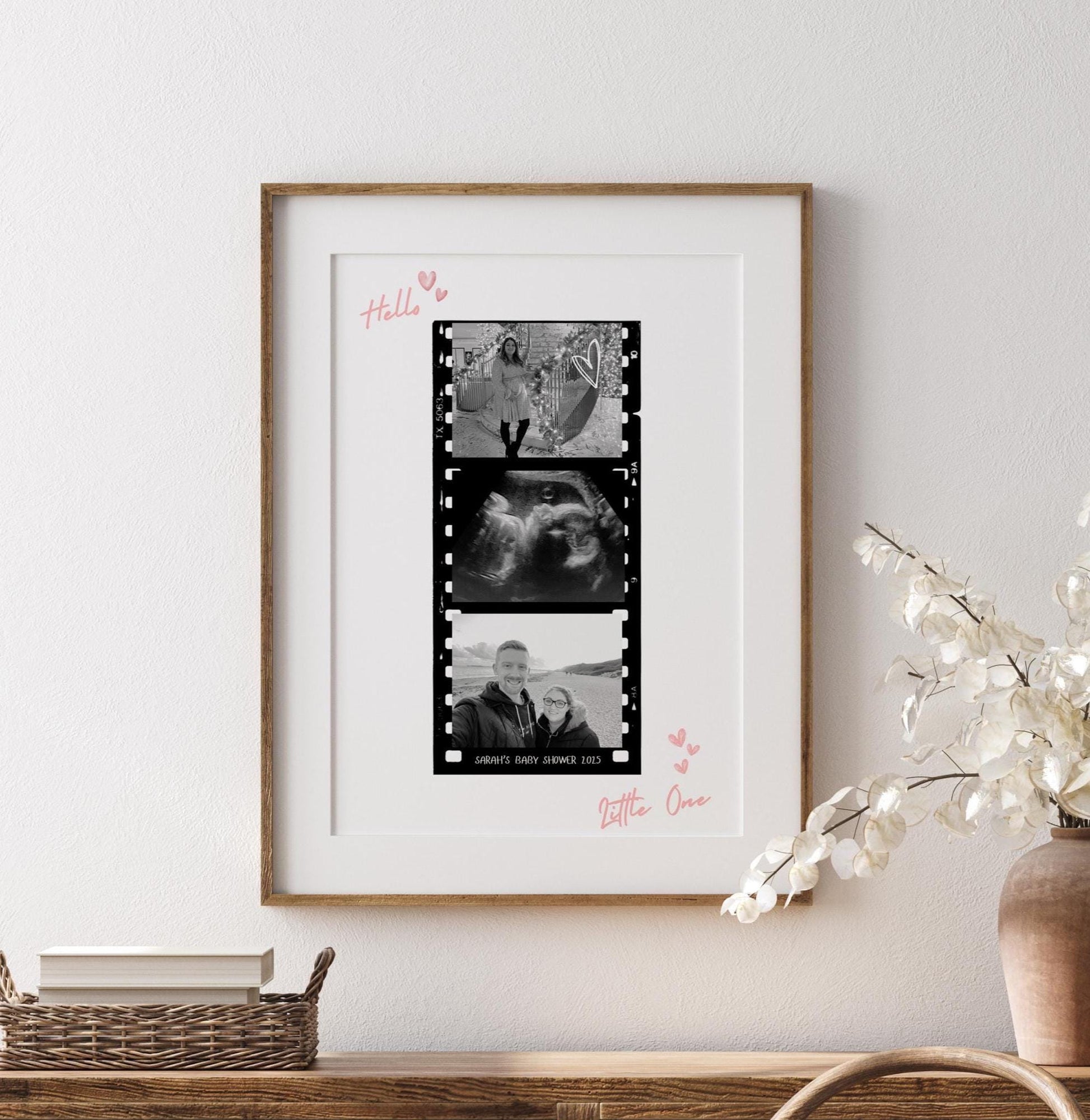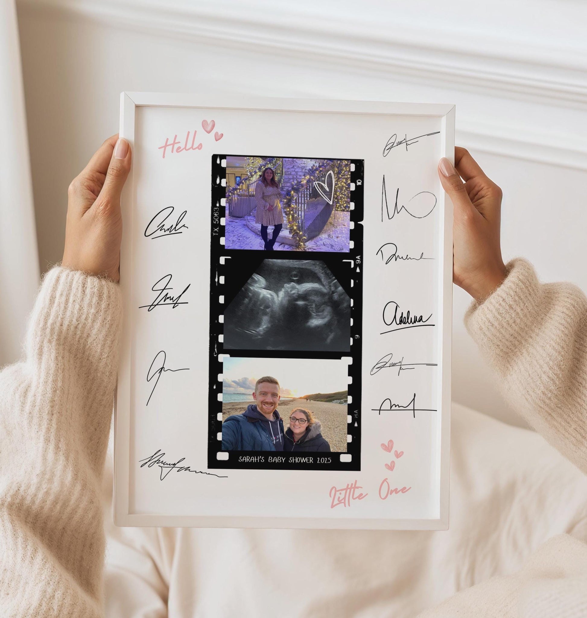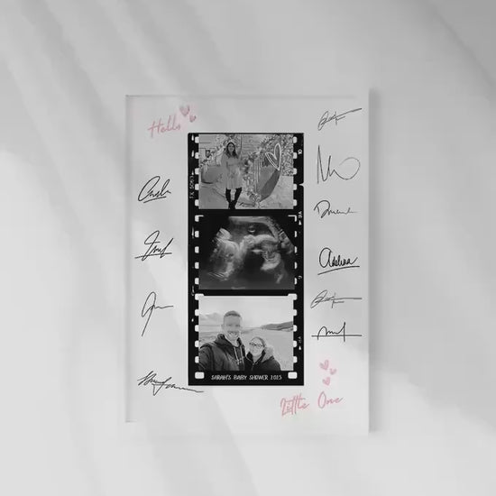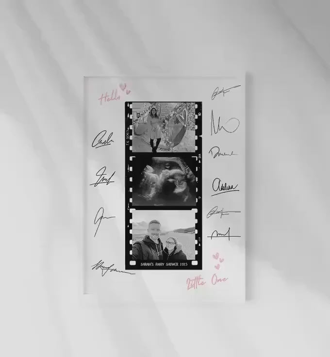 Turn memories into a meaningful keepsake with this personalised baby shower photo frame - a touching and creative alternative to the traditional baby shower guestbook. This unique gift features a filmstrip-style photo layout including your baby's ultrasound, pictures of the parents-to-be, and a border of custom signatures from family and friends.