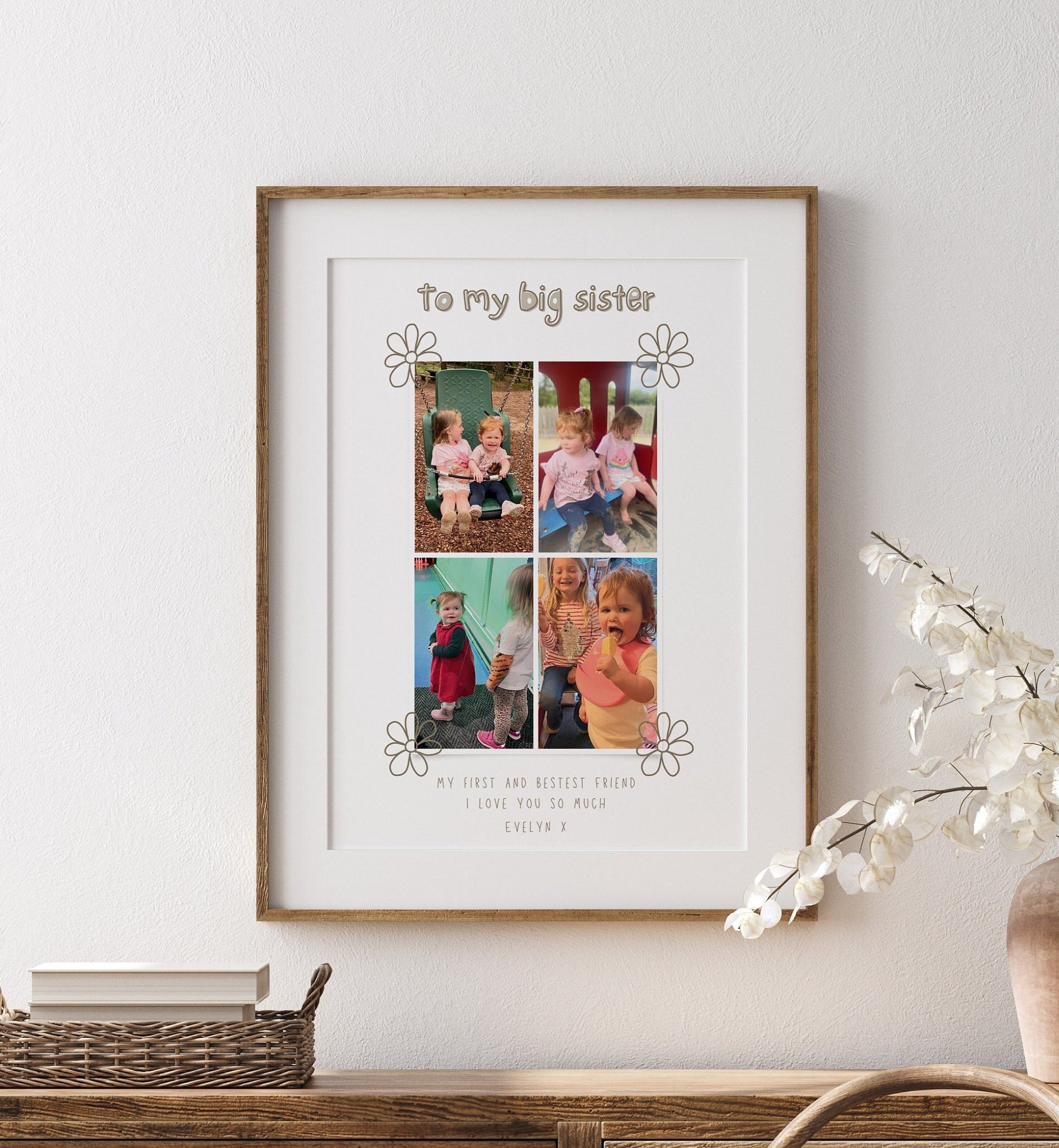 This stunning big sister photo gift is a wonderful piece for any new or growing big sister. A present designed to capture 4 wonderful photos from their little brother or sister. This print also has a lovely message that reads 'My first and bestest friend. I love you so much.' Then signed off with the name of the individual the print is from.