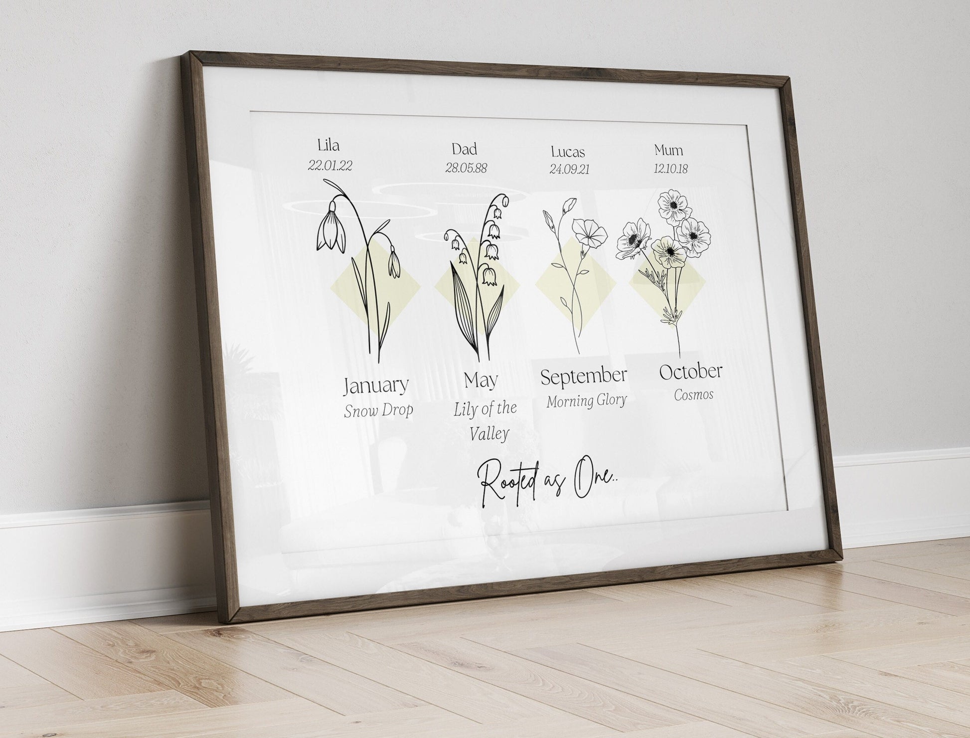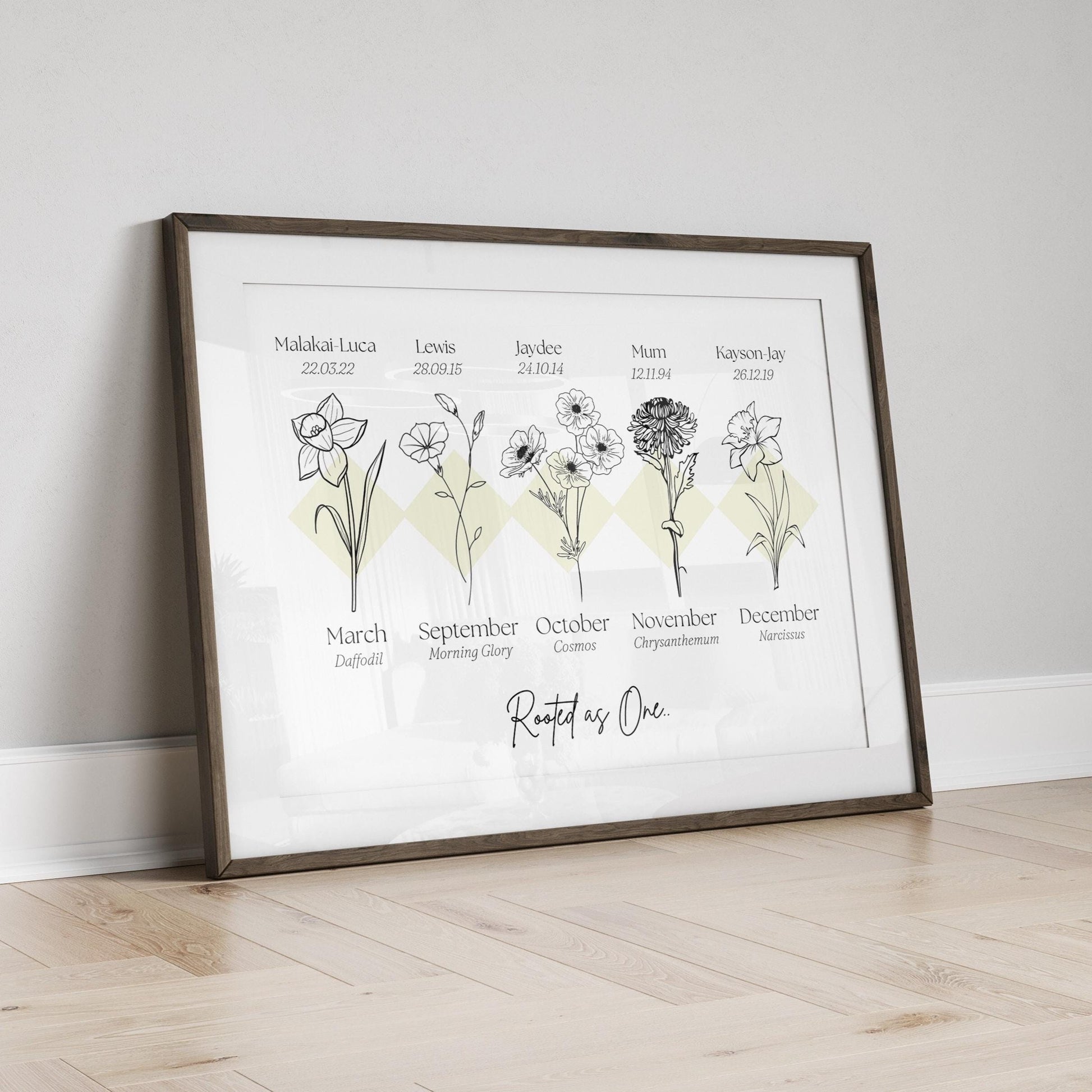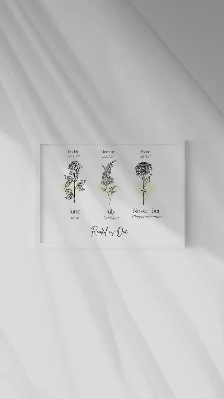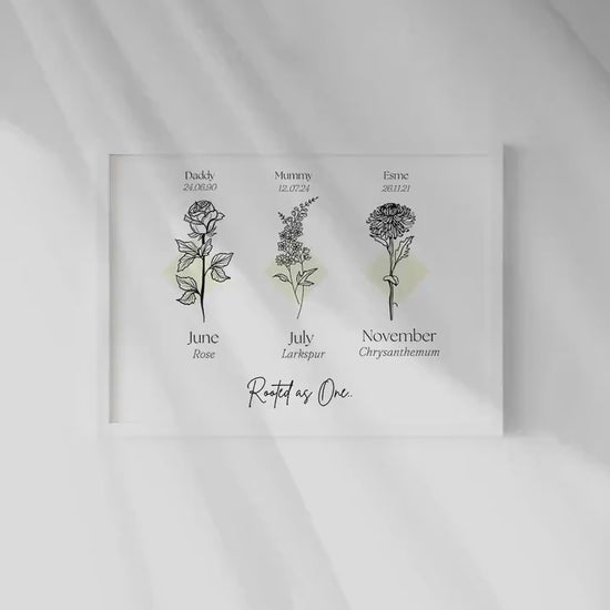 Our personalised print captures your family birth months in lovely line art style detail. This print can have up to 6 flowers within with a minimalist style fully customised to order. This is a truly unique way to capture a beautiful growing family in stunning detail.