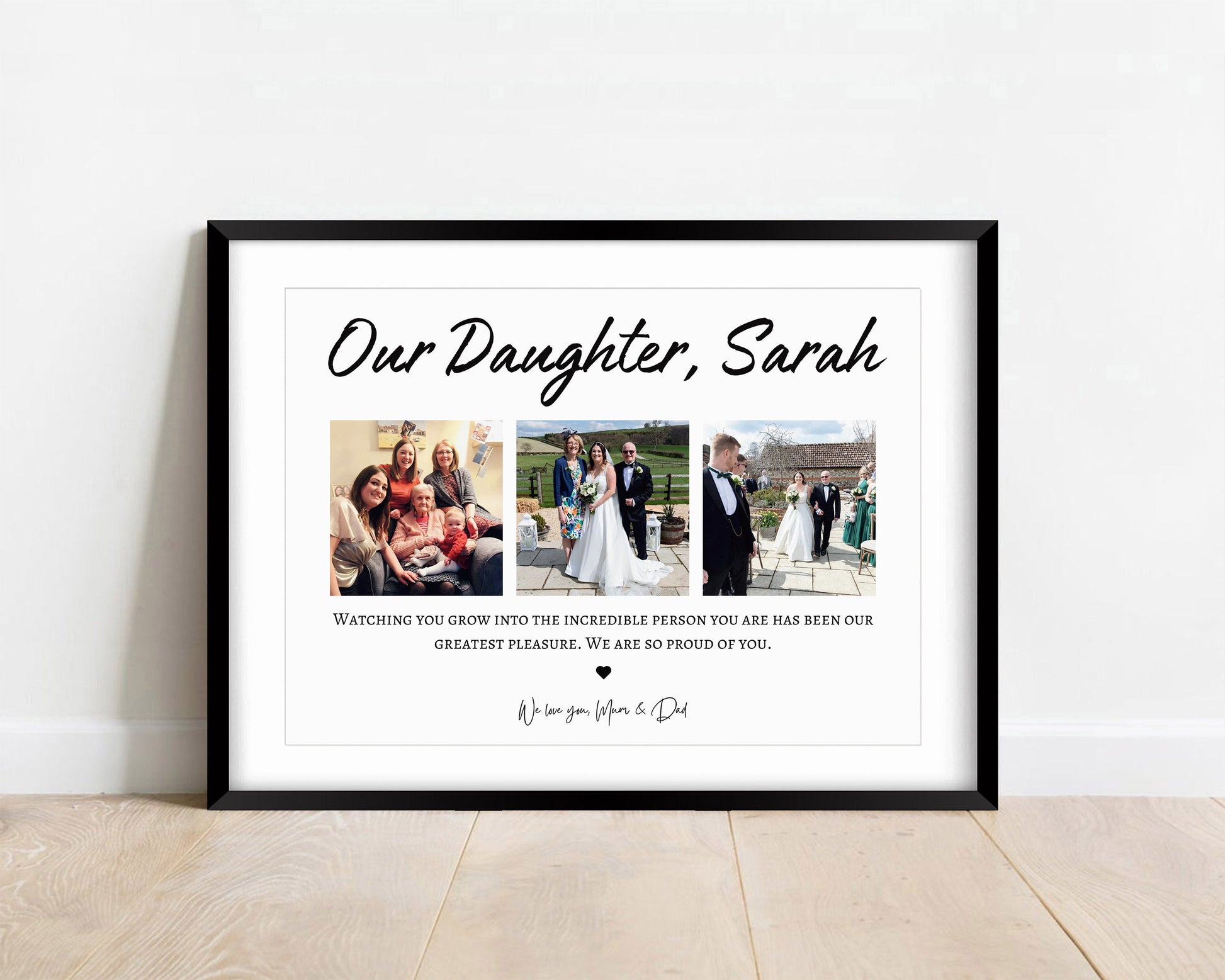 Treat an incredible Daughter with this sentimental and beautiful customised photo print. Fully personalised to order with photos that capture the wonderful relationship with the daughters name on the main line, and lovely quote that reads 'Watching you grow into the incredible person you are has been our/ my greatest pleasure. We/ I are/am so proud of you and a sign off at the bottom for whoever is gifting the print.