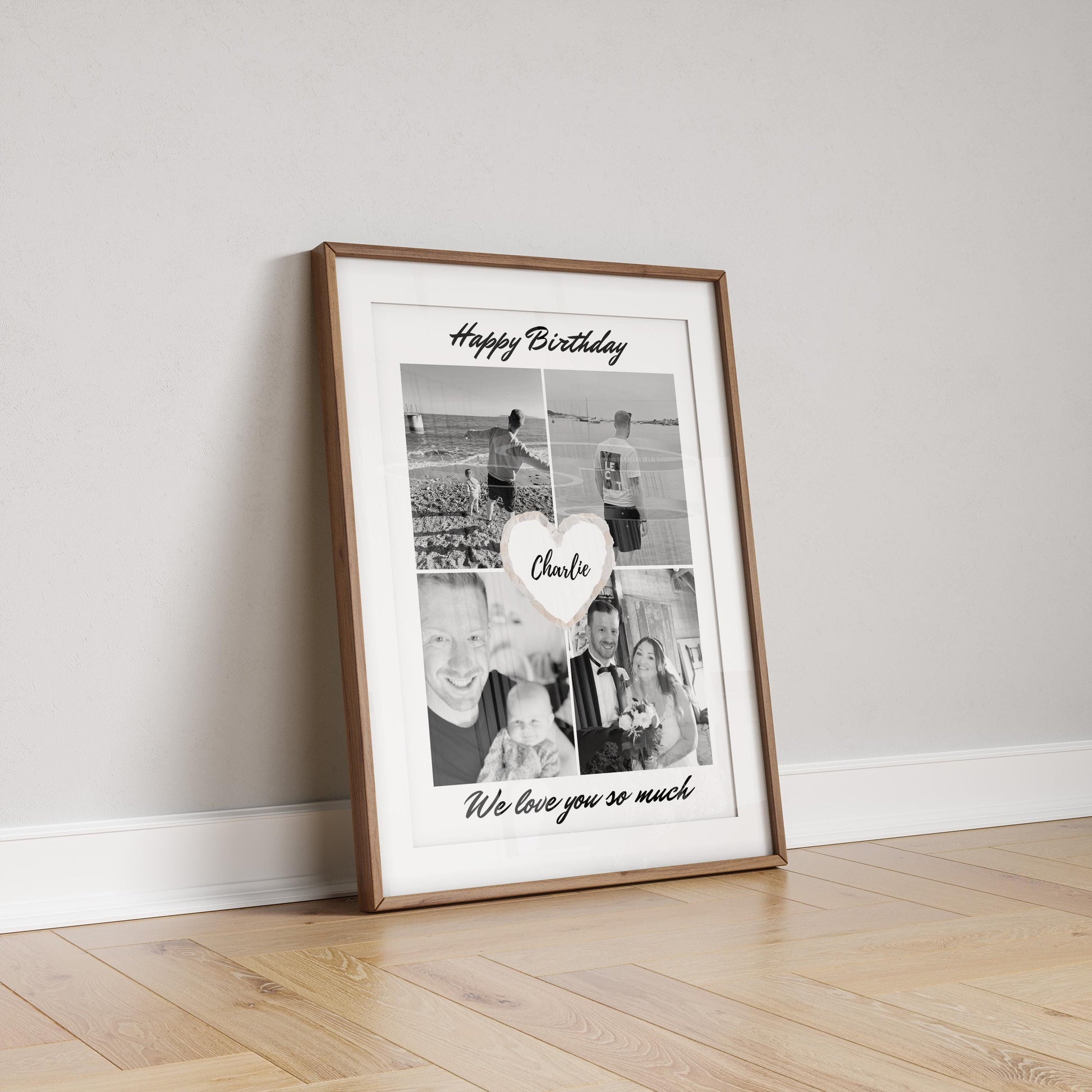 Introducing our Personalised Happy Birthday Photo Print - A Unique Gift to Celebrate Their Special Day! Celebrate someone's special day with a custom, one-of-a-kind birthday photo print! This beautiful print features 4 of your favorite photos in black and white, with a heart-shaped design in the center showcasing their name. The top of the print includes the message "Happy Birthday" and the phrase and at the bottom "We Love You So Much" to make it extra special. The quote is totally changeable so please specify any specifics in the personalistion section.