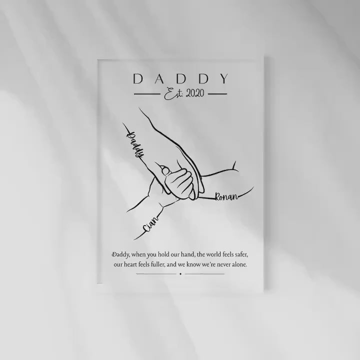 Looking for a meaningful gift for a special dad? This personalised handprint art is a beautiful way to celebrate the bond between a father and his kids. Each print features a miniamlist line drawing of dad's hand holding his children's hands, with their names and the year he became a father.
