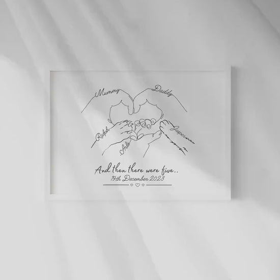 The quote reads 'And then there were five' with the date the baby was born. This beautiful print captures a family with their wonderful baby, their dog and their cat.