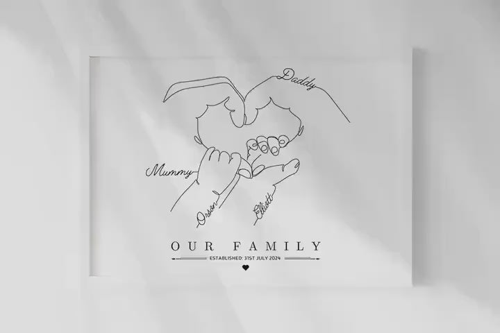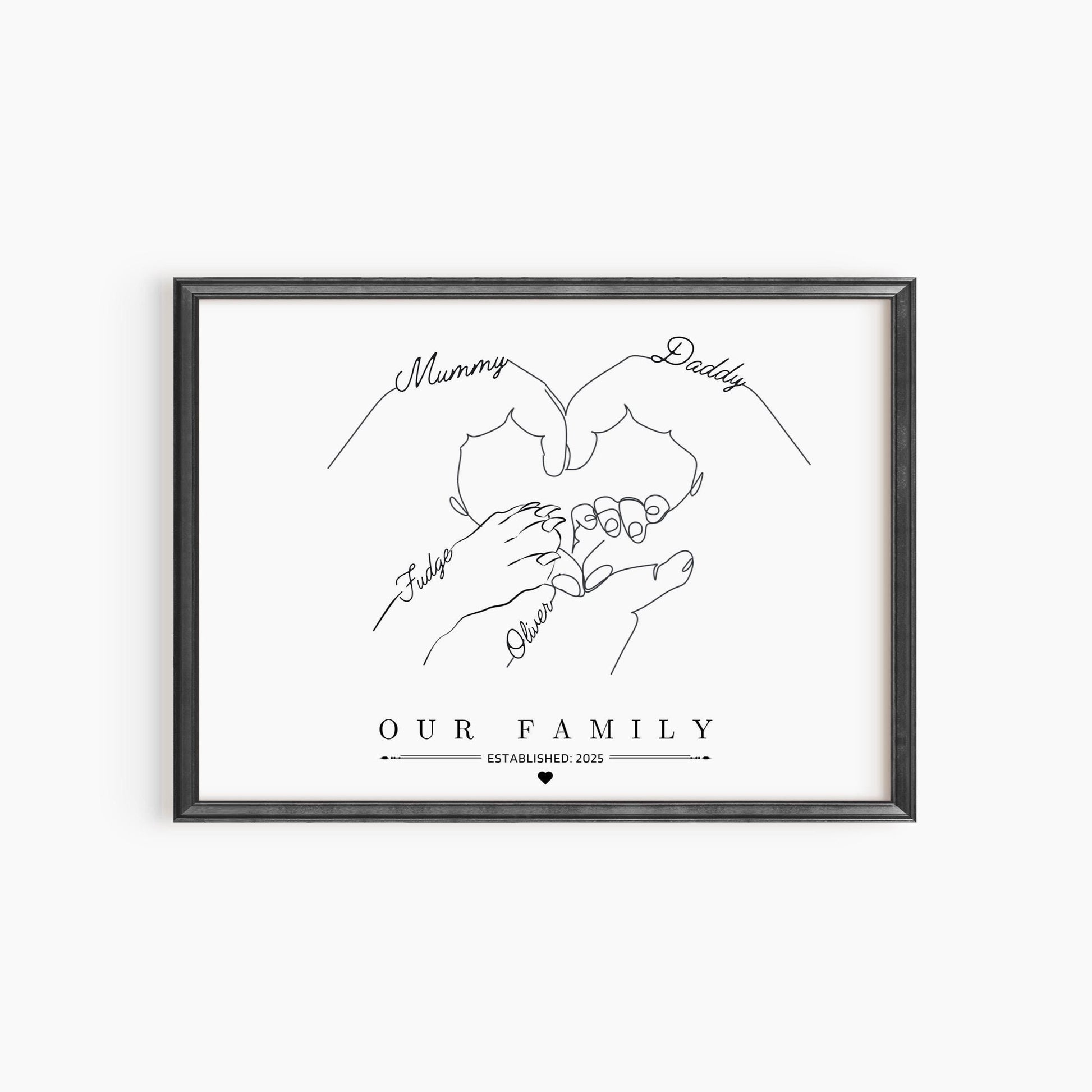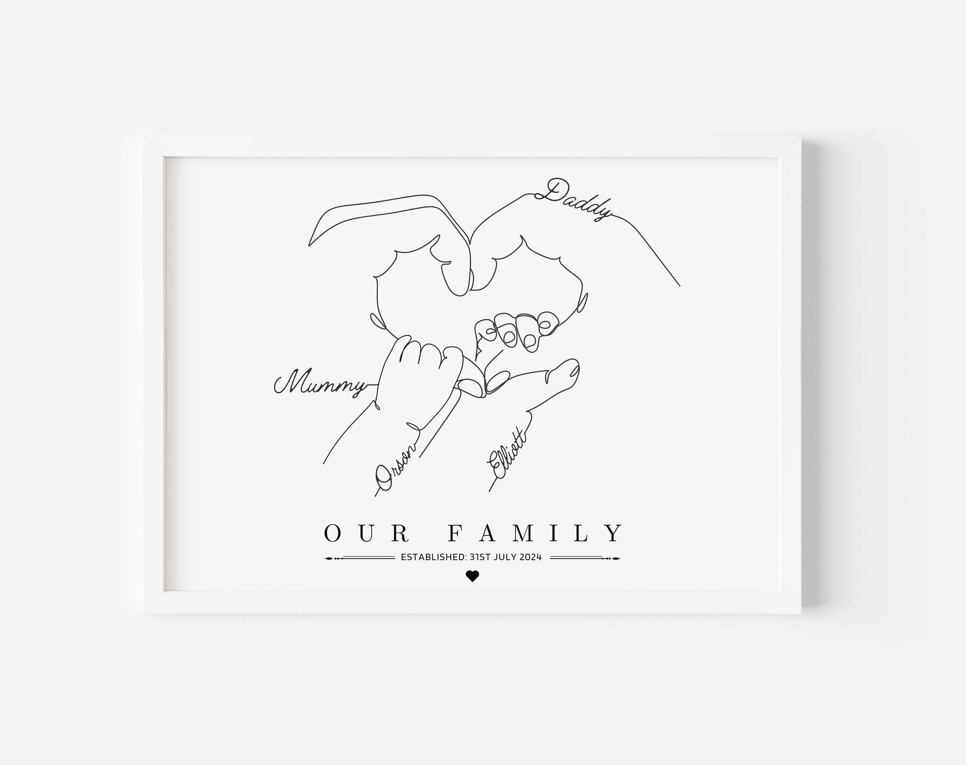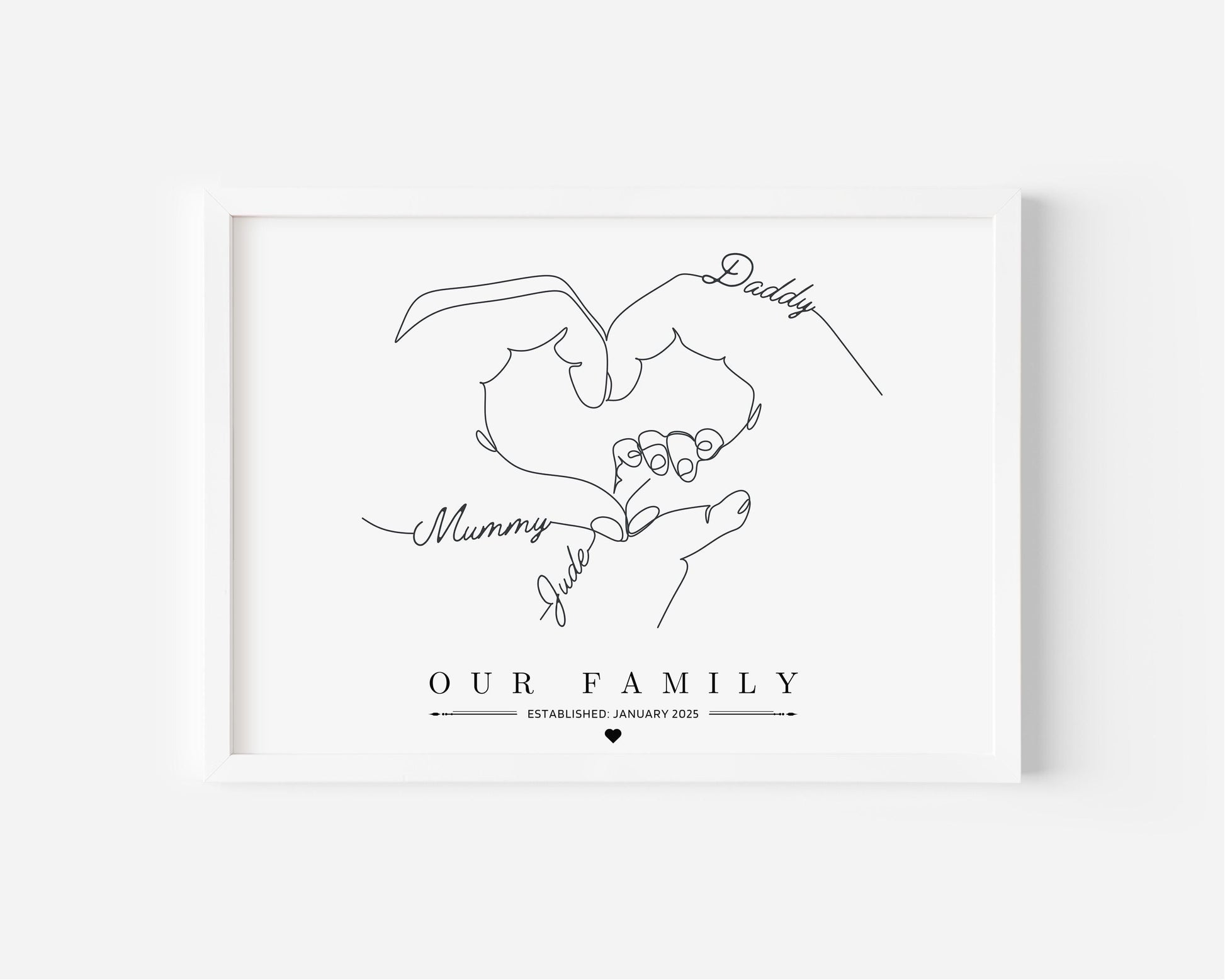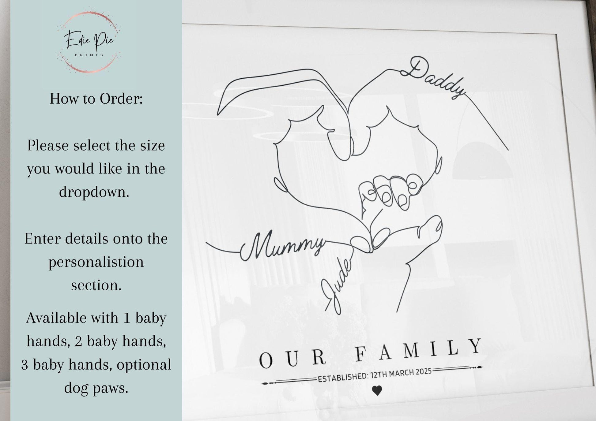 Introducing our beautiful family hands line design with this custom line art print, featuring a delicate hand outline of parents and children. This elegant and modern artwork is the perfect newborn baby gift, anniversary present, or heartfelt keepsake for Mother's Day, Father's Day, or any special occasion. Available with 1 - 3 baby hands and optional dog paws.