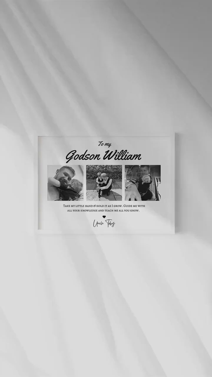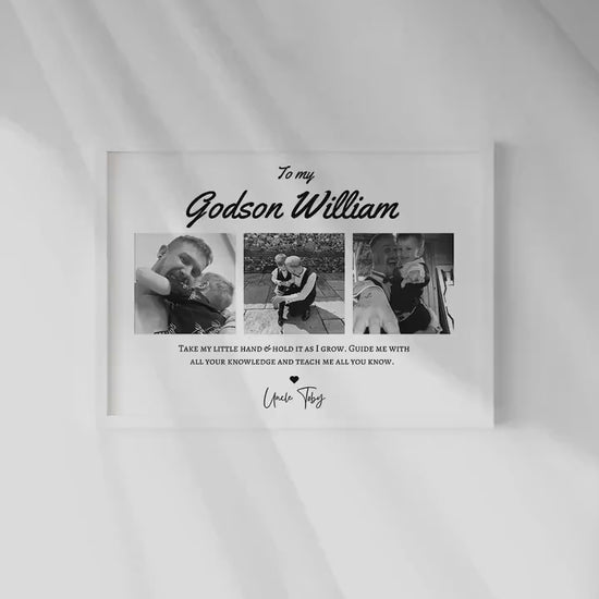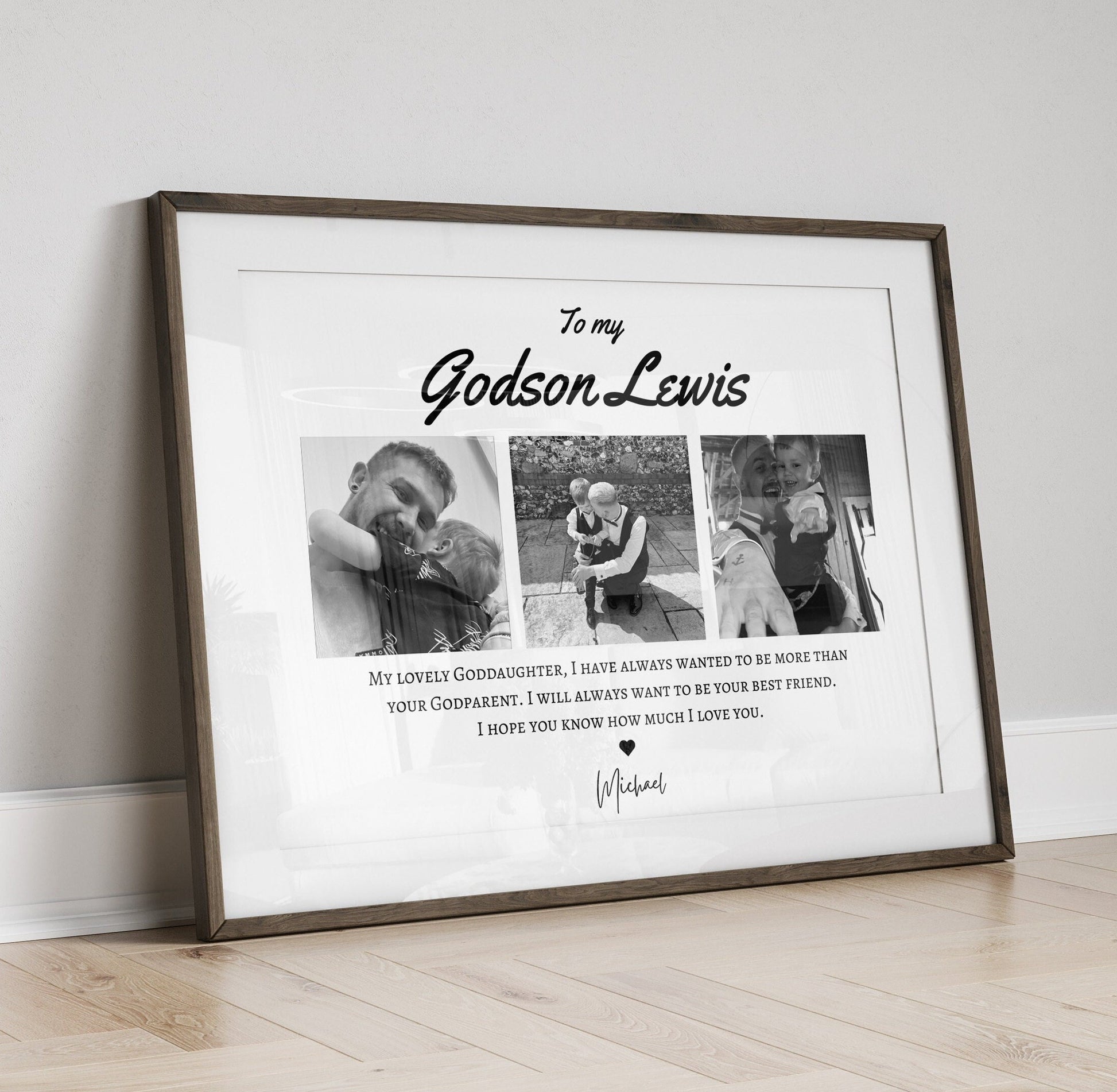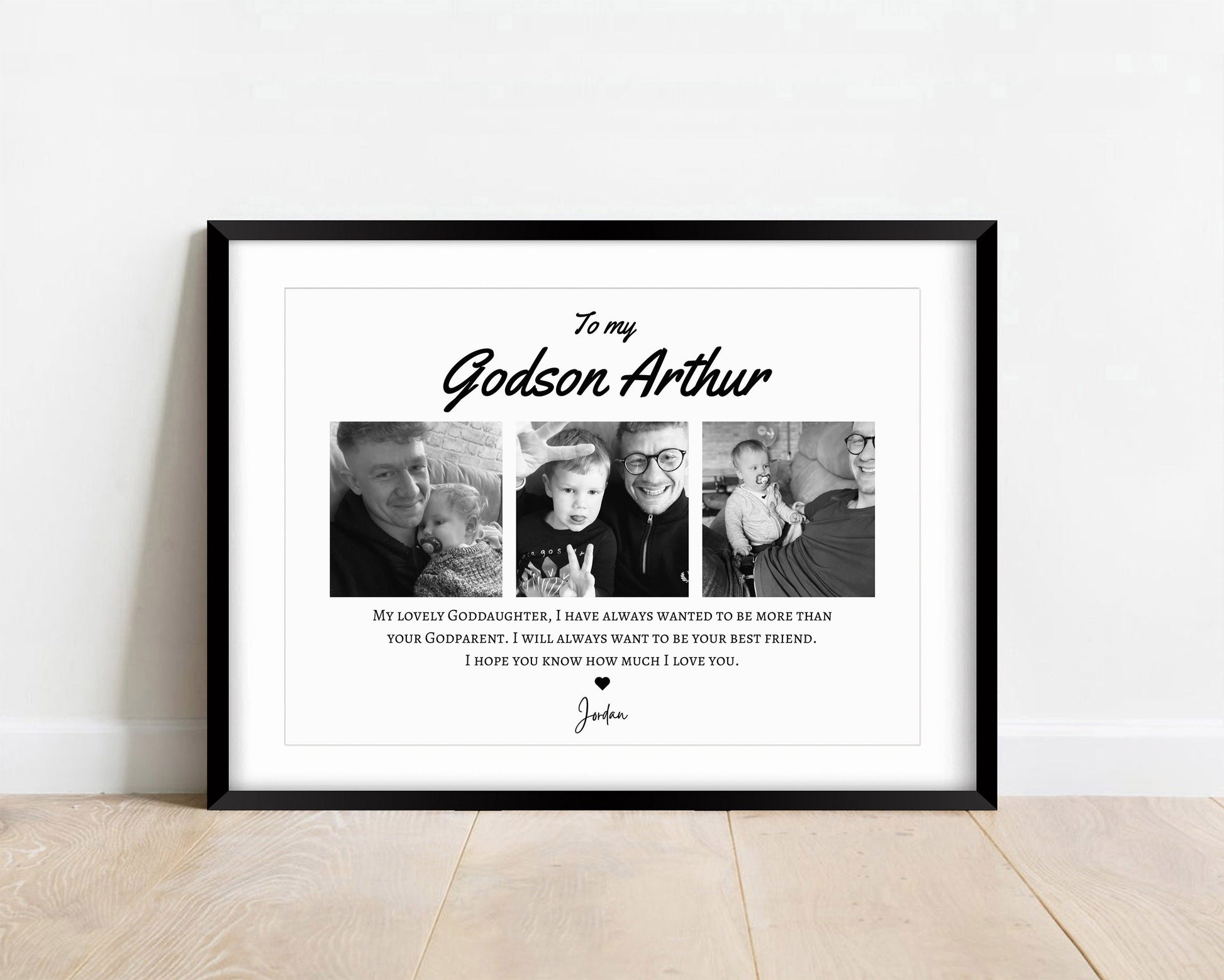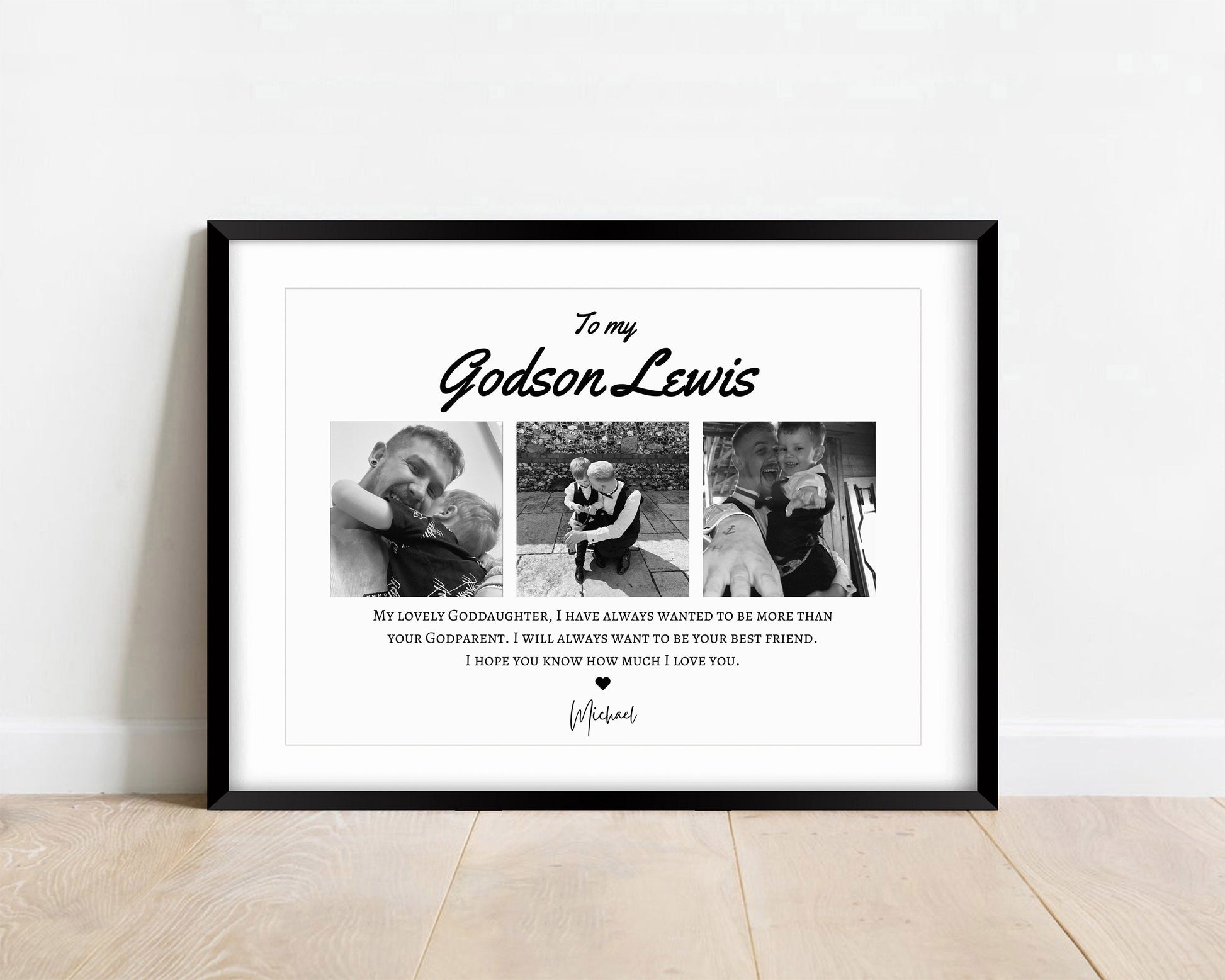 Treat an incredible Godson with this sentimental and beautiful customised photo print. Fully personalised to order with photos that capture the wonderful relationship with the Godchilds name, the Godparents names and a quote that reads 'My lovely Godson, I have always wanted to be more than your Godparent. I will always want to be your best friend. I hope you know how much I love you.'