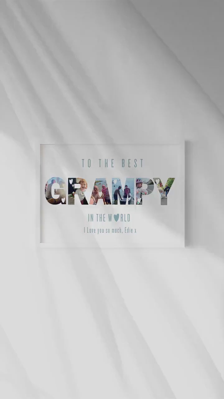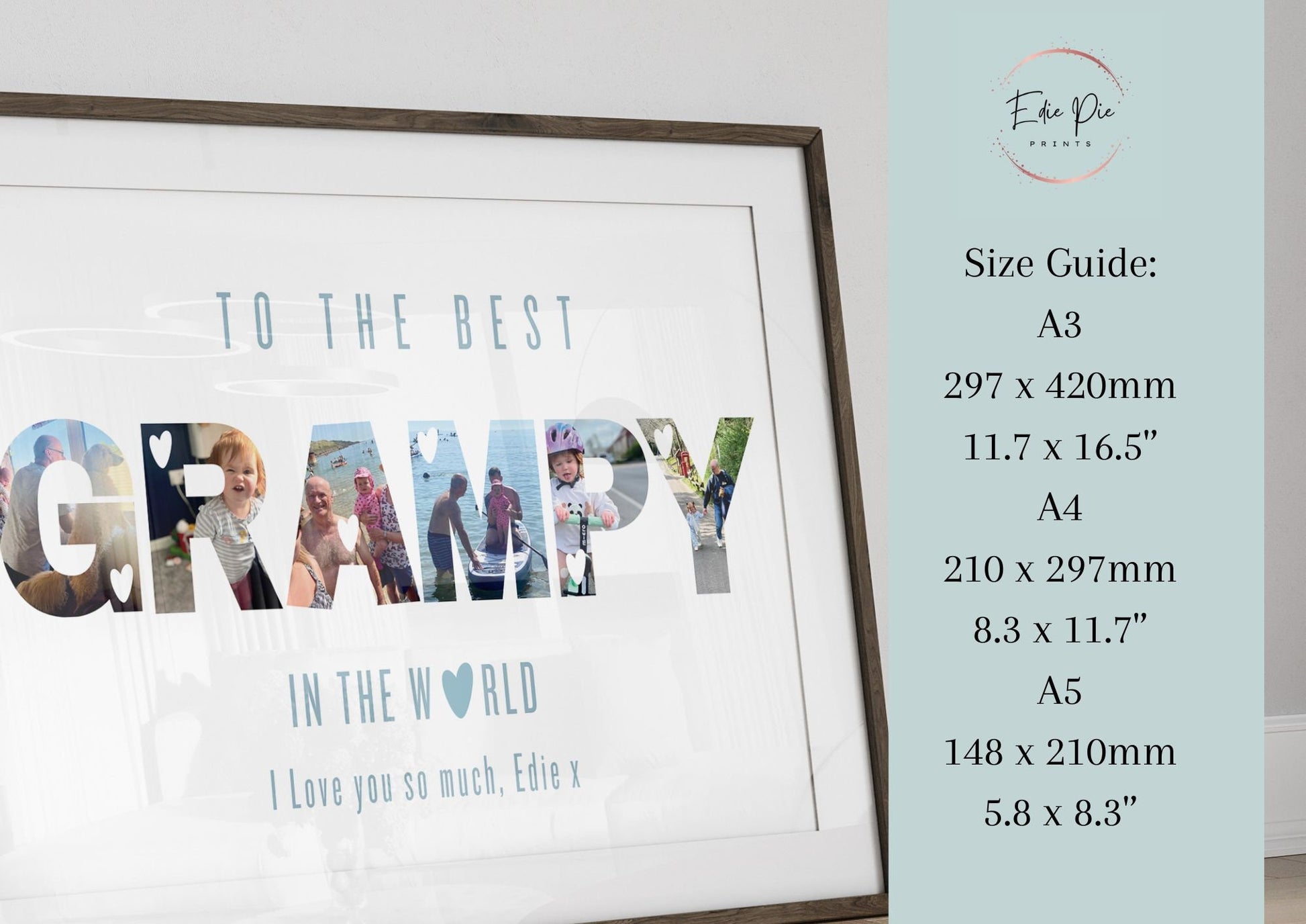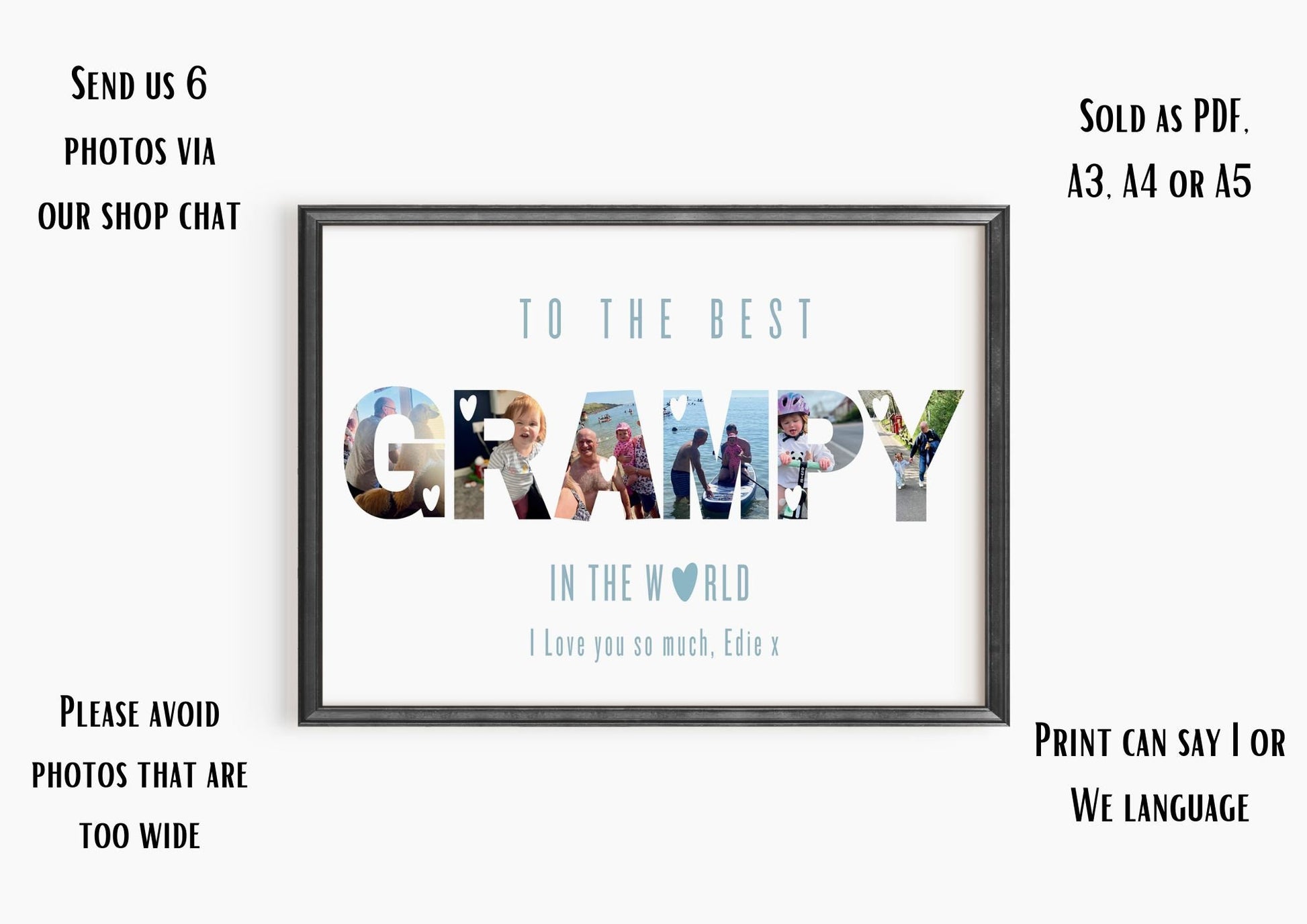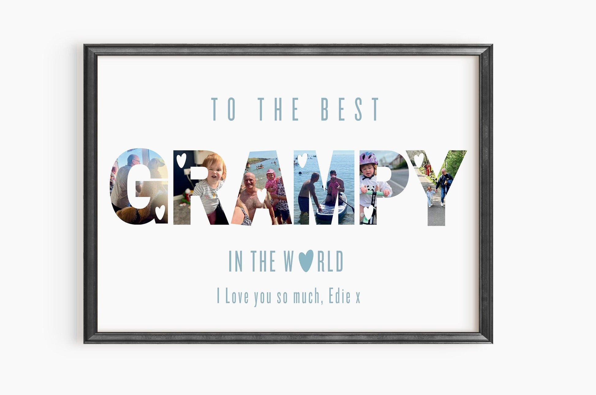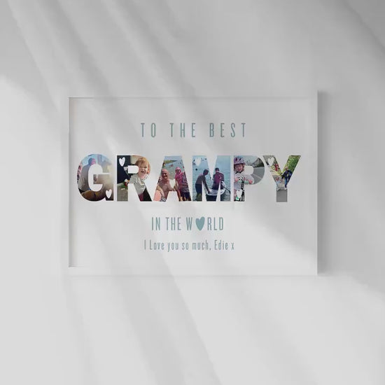 Treat an incredible Grandad with this sentimental and beautiful customised photo print. Fully personalised to order with photos that capture the wonderful relationship between an amazing Grampy and his Grandson and or Grandaughter. This stunning poster captures 6 gorgeous photos within the letters Grampy in either mono or colour finish.