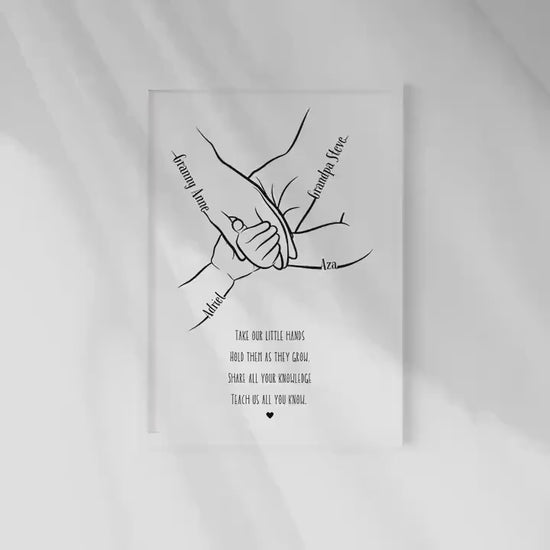 Celebrate the precious bond between generations with this custom family handprint art print. This beautifully illustrated line art features up to four children's hands held lovingly by grandparents or parents, personalized with each name for a one-of-a-kind keepsake.