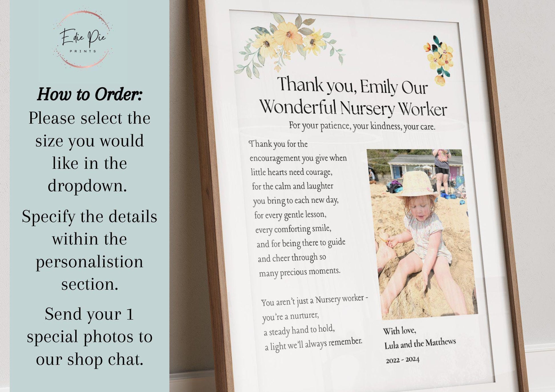 Each print is carefully designed and can be personalised with your child's photo, names and dates. Printed on premium quality paper and beautifully framed, it makes a unique gift for nursery staff, childminders, preschool teachers or daycare workers.
