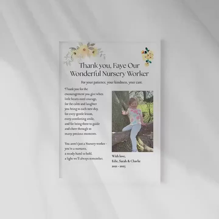 Show your heartfelt gratitude with this personalised nursery worker thank you gift. This custom print features a thoughtful poem, your own photo, and the name of your special nursery teacher or keyworker. Perfect as an end of term gift, leaving present or appreciation keepsake, this framed print will remind them how much they are valued every day.