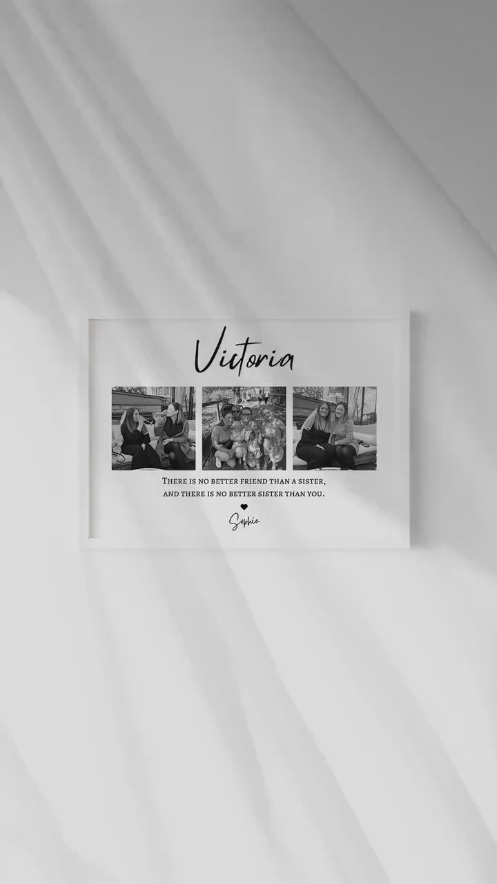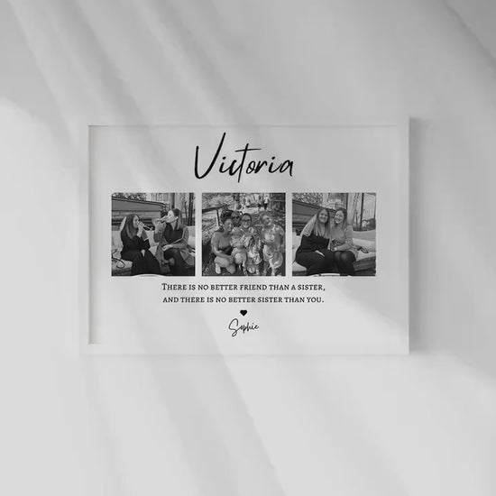 Treat an incredible sister with this sentimental and beautiful customised photo print. Fully personalised to order with photos that capture the wonderful relationship with the sisters first name, the name of the person gifting the print and a quote that reads 'There is no better friend than a sister,