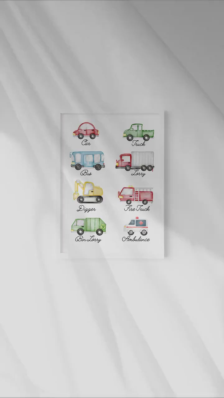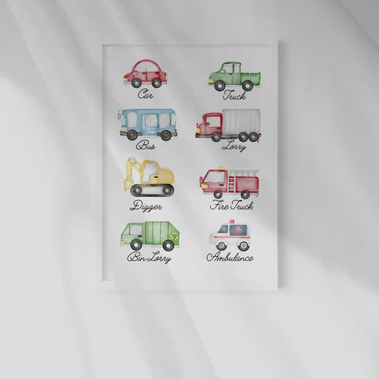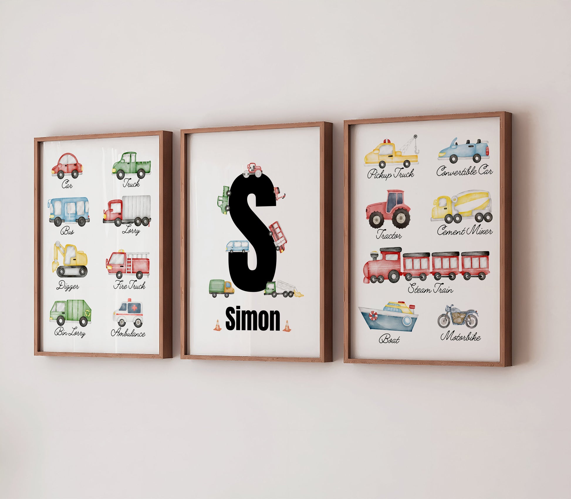This stunning and car and vehicle print Set is a stunning finishing piece for any motor loving childs bedroom room. In a watercolour style 16 different vehicles listed on each side, centred with the name and intial of the child the prints are for.