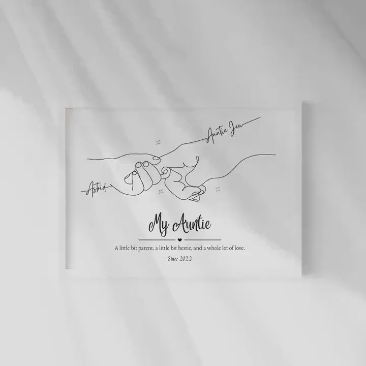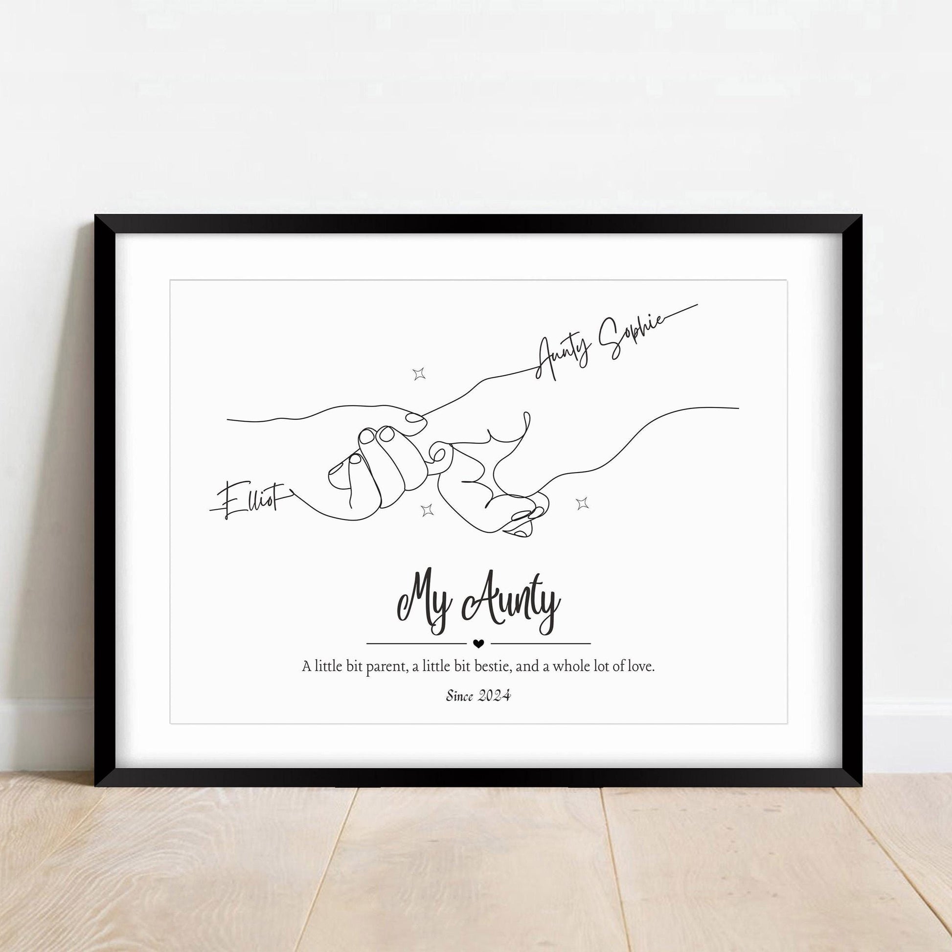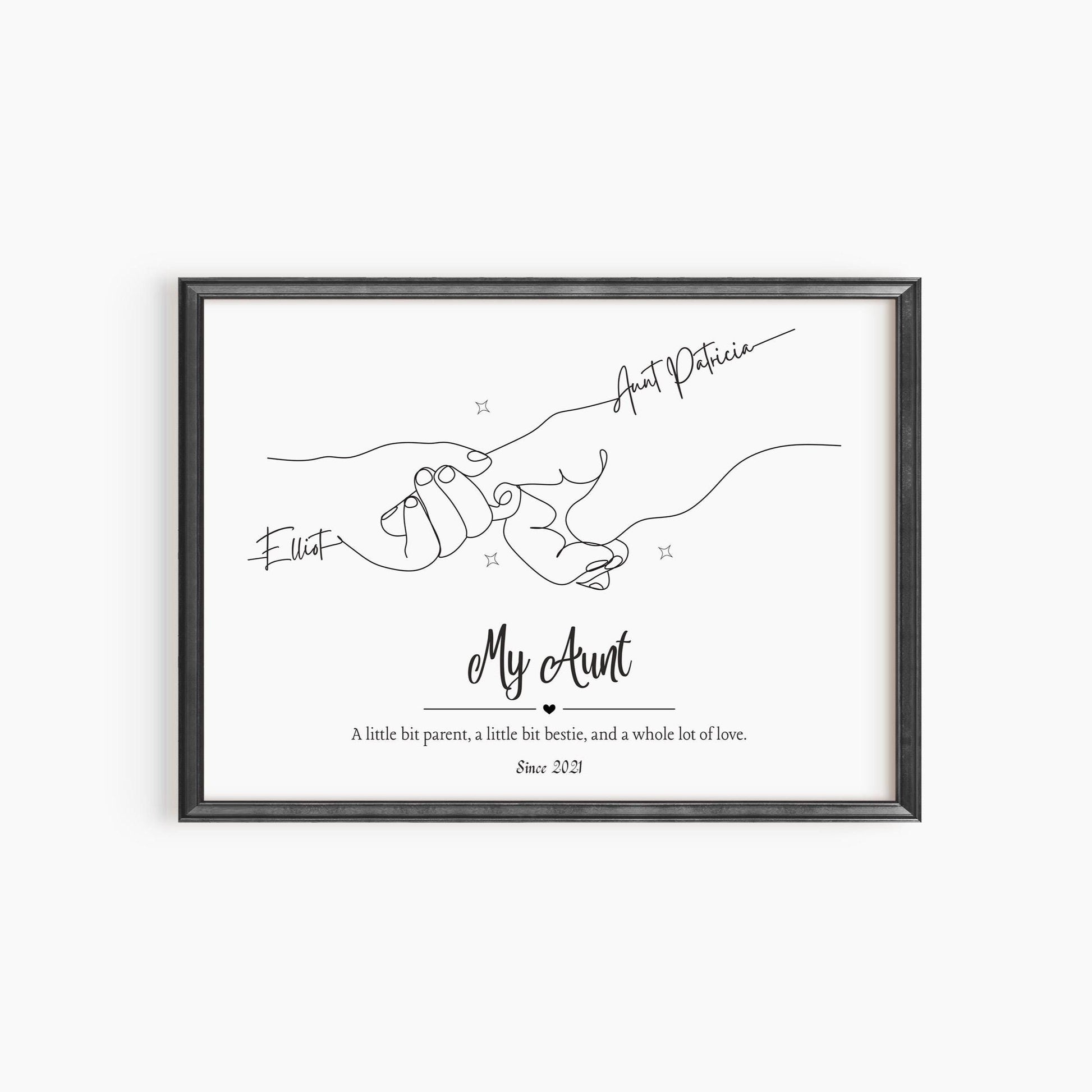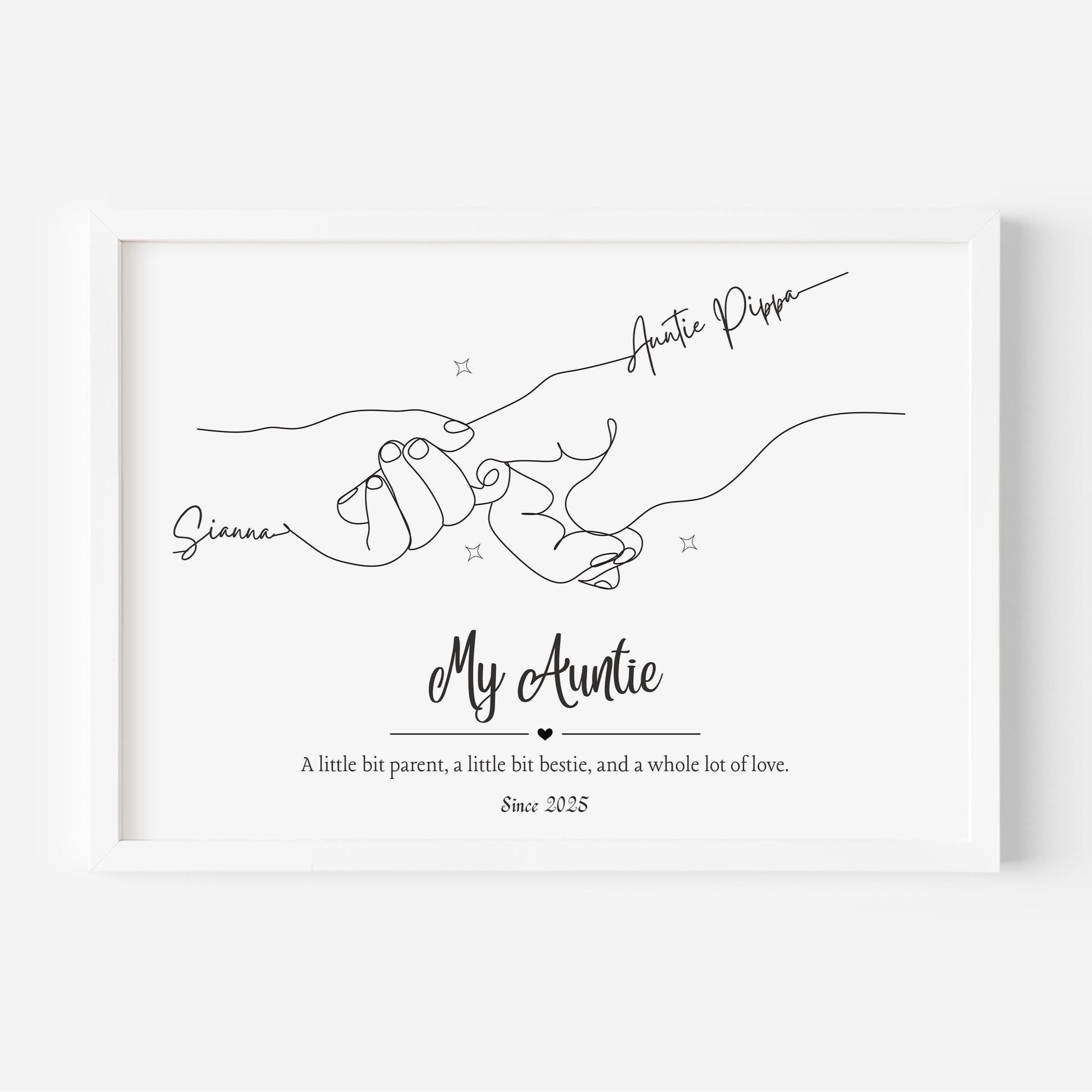This custom hand-drawn line art print features two hands connected - one small, one grown - symbolizing love, guidance, and lifelong connection. Customised with names and a "Since [Year]" date, this minimalist artwork makes the perfect gift for a new aunt, a baby announcement, or a sweet thank-you to the coolest aunt around.