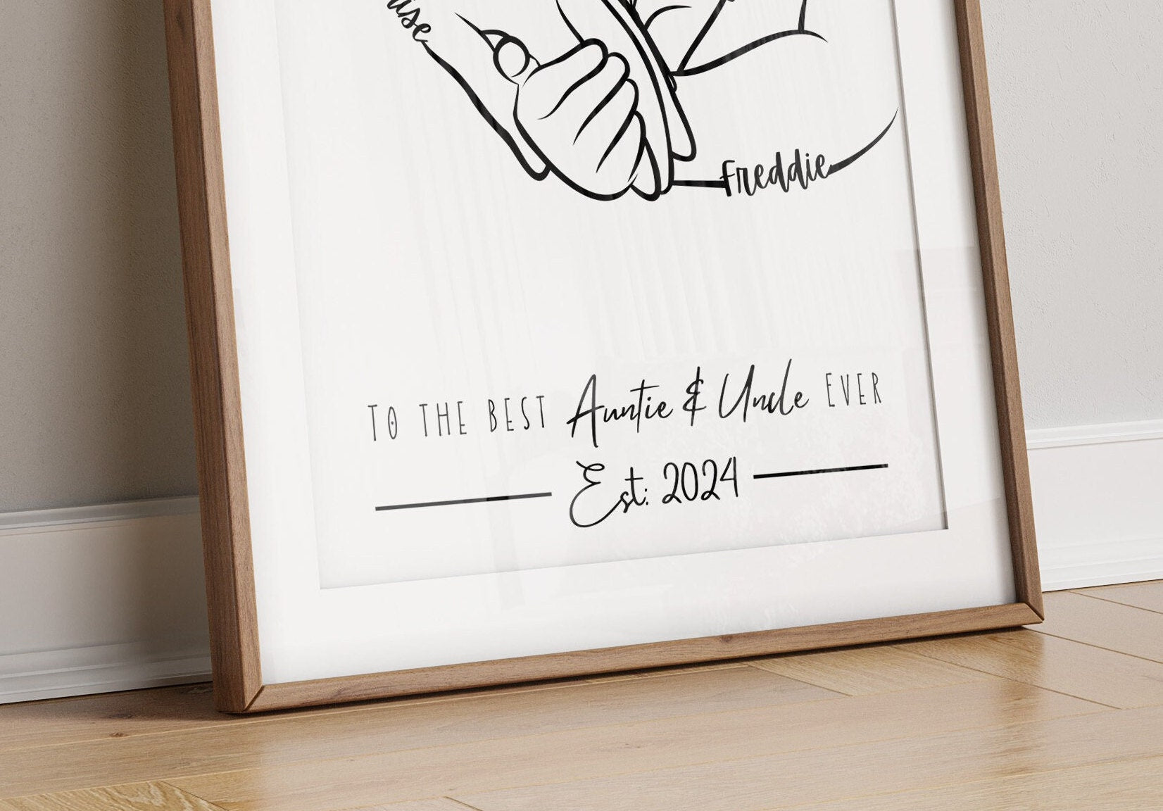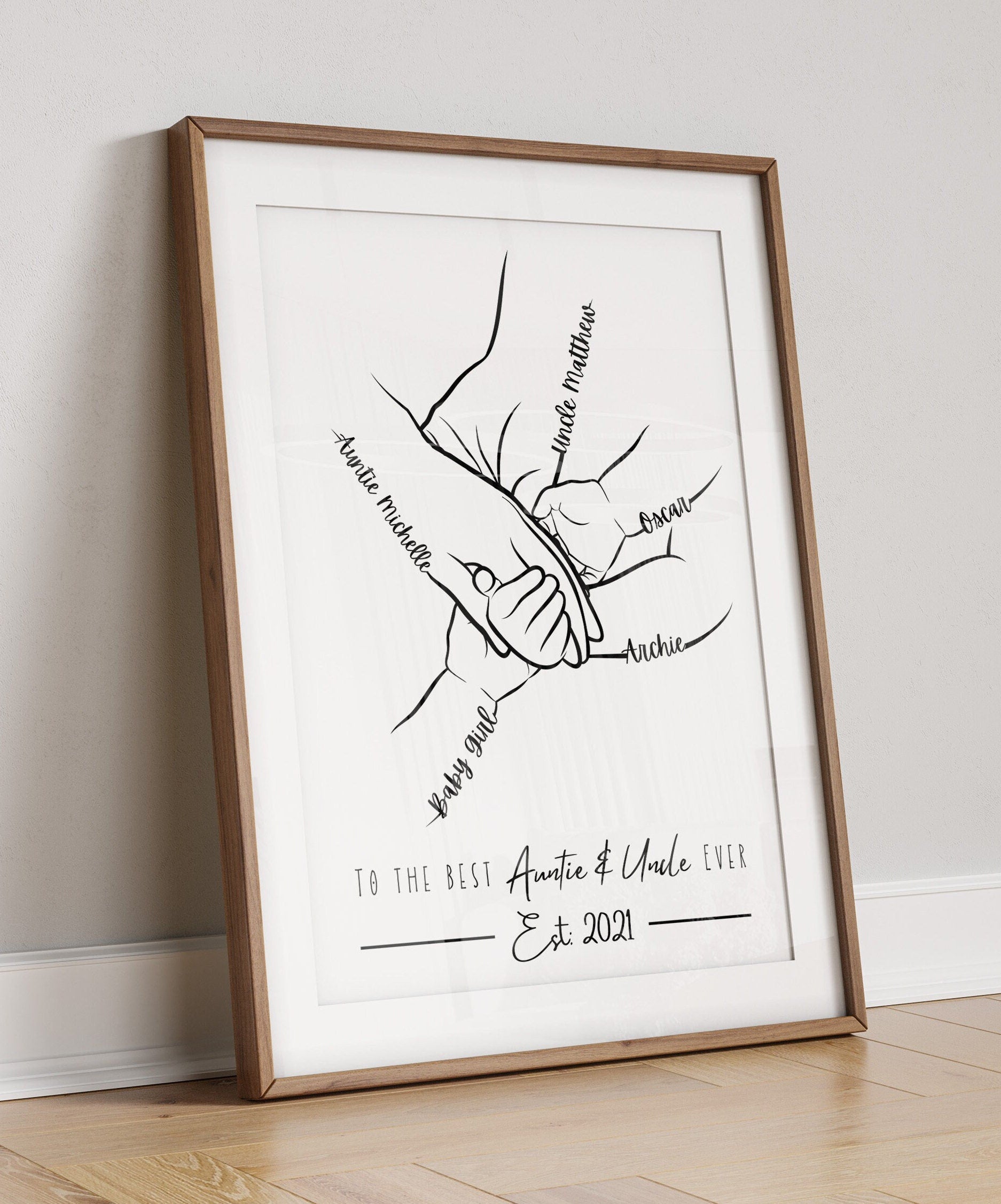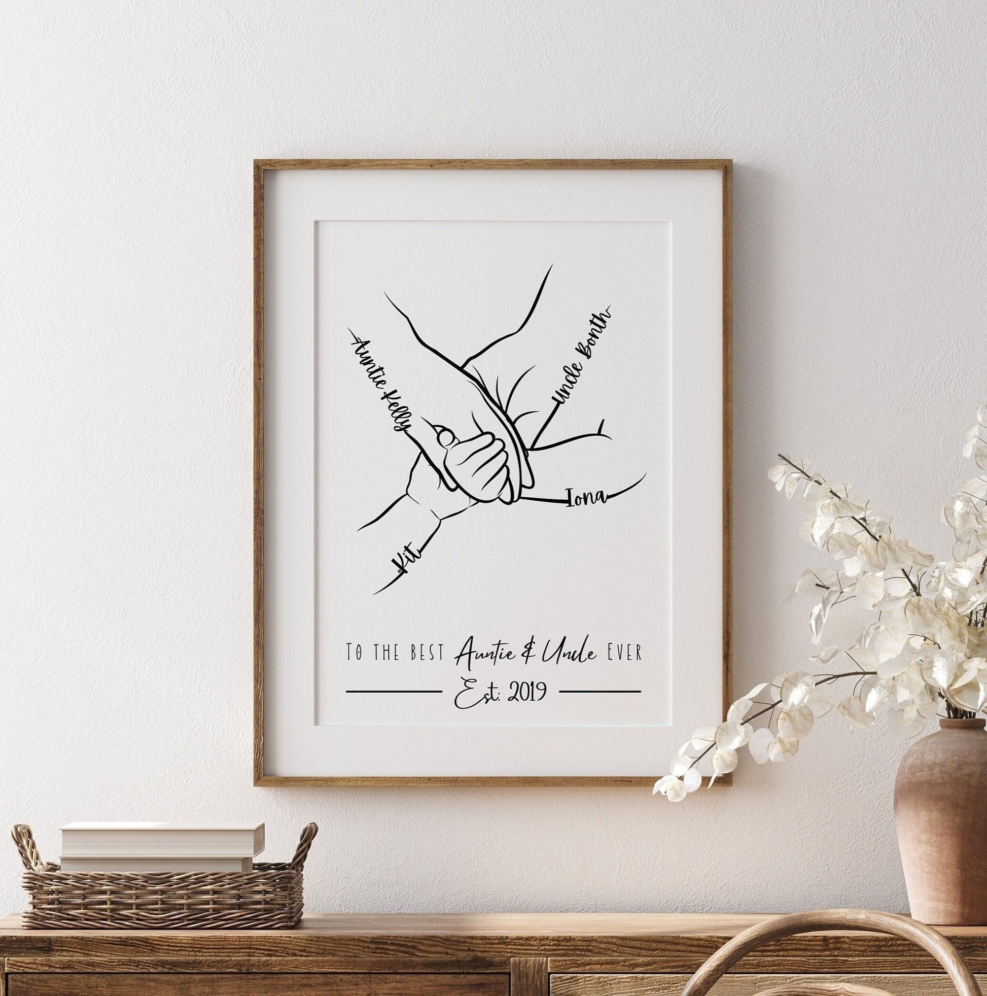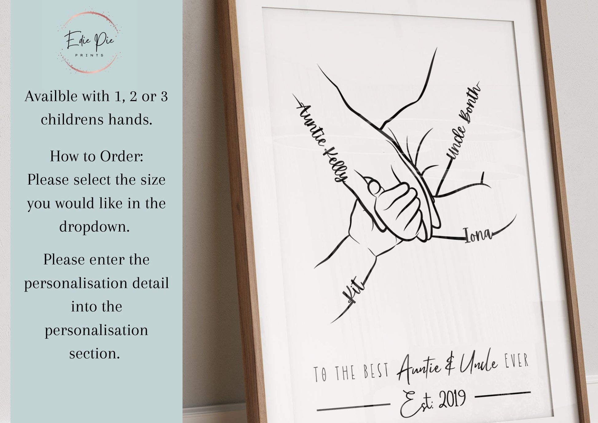 Treat an amazing Auntie and Uncle with a lovely sentimental gift this Birthday or Christmas with this unique personalised hands line art print. A way to capture a beautiful relationship between an Uncle & Auntie and their Nephew or Niece.