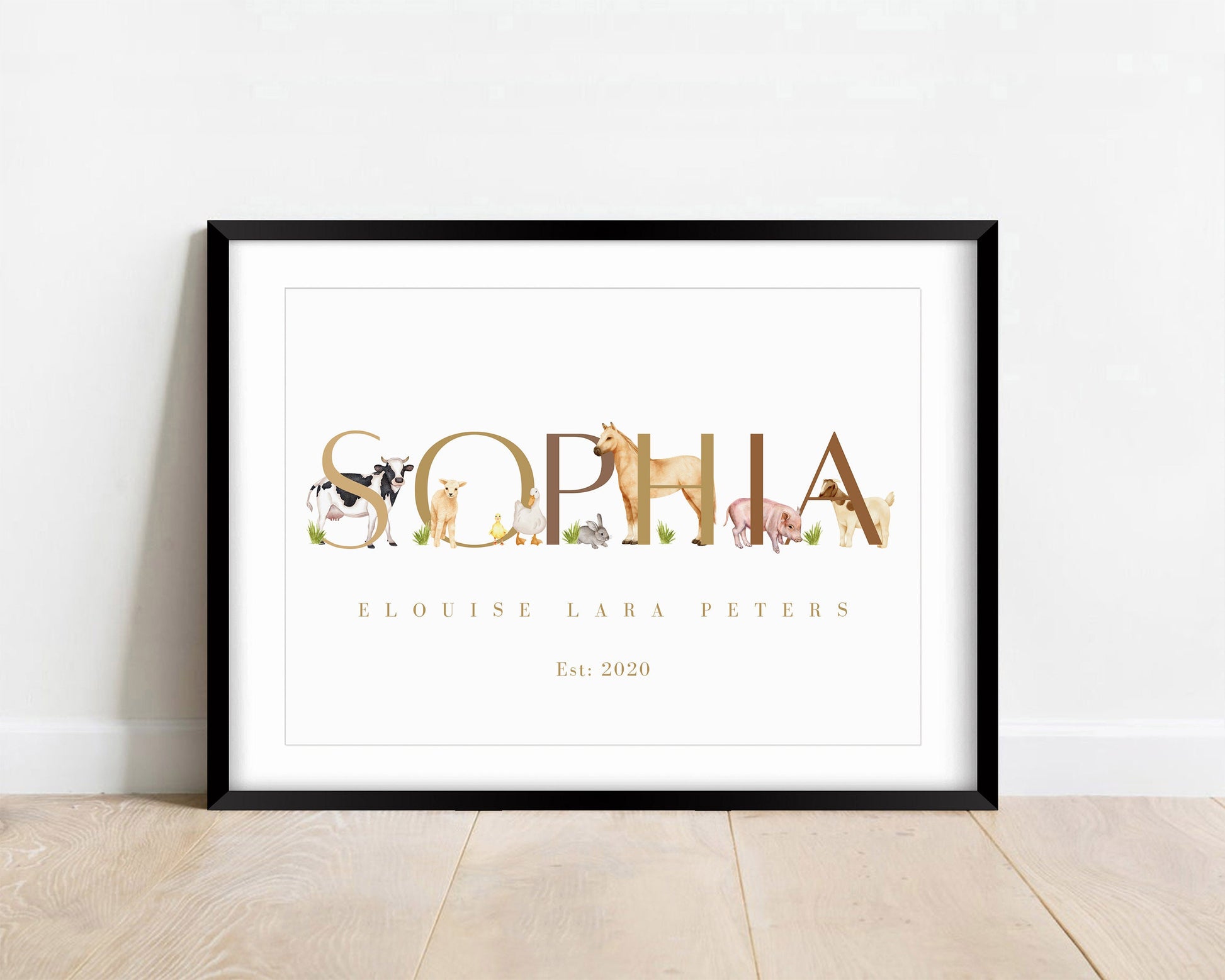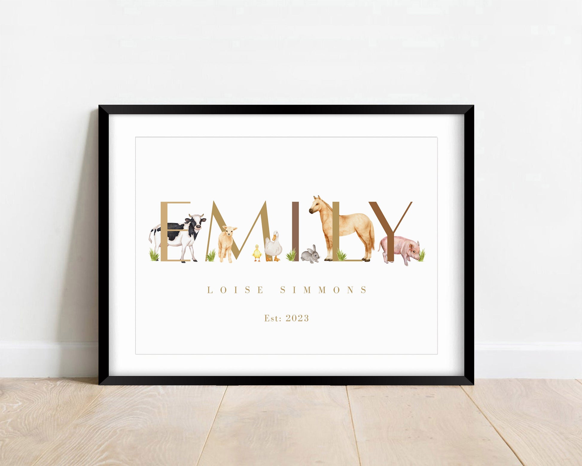 Introducing our Farm Name Print which is fully personalised to order with cute watercolour farm animals intwined within the letters. With stunning neutral colours throughout the design and printed on our crisp white 220gsm matte photo paper.