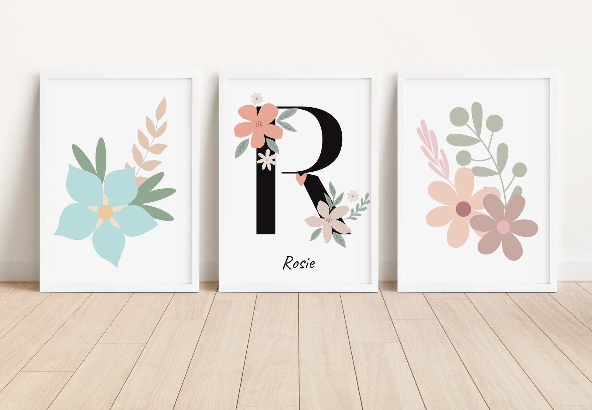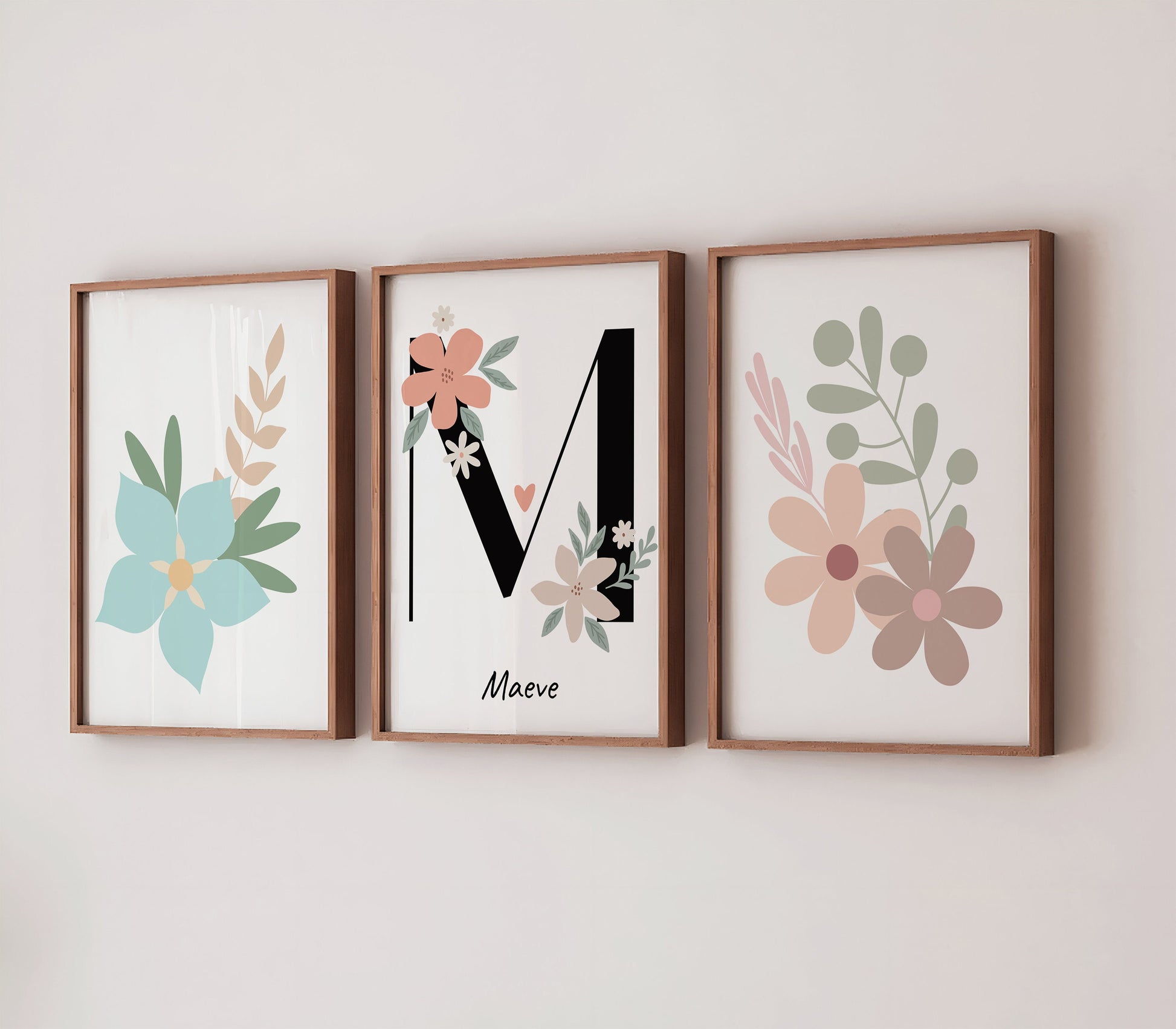 Introducing our new personalised floral pastel print set of 3. Perfect to decorate any botanical themed bedrooms or nursery settings. Designed with neutral colours and simplistic style. This is a gorgeous finishing piece for your little girls personal space. Each print has its own pastel flowers with the middle print being customised to order with the name of the person the print is for.