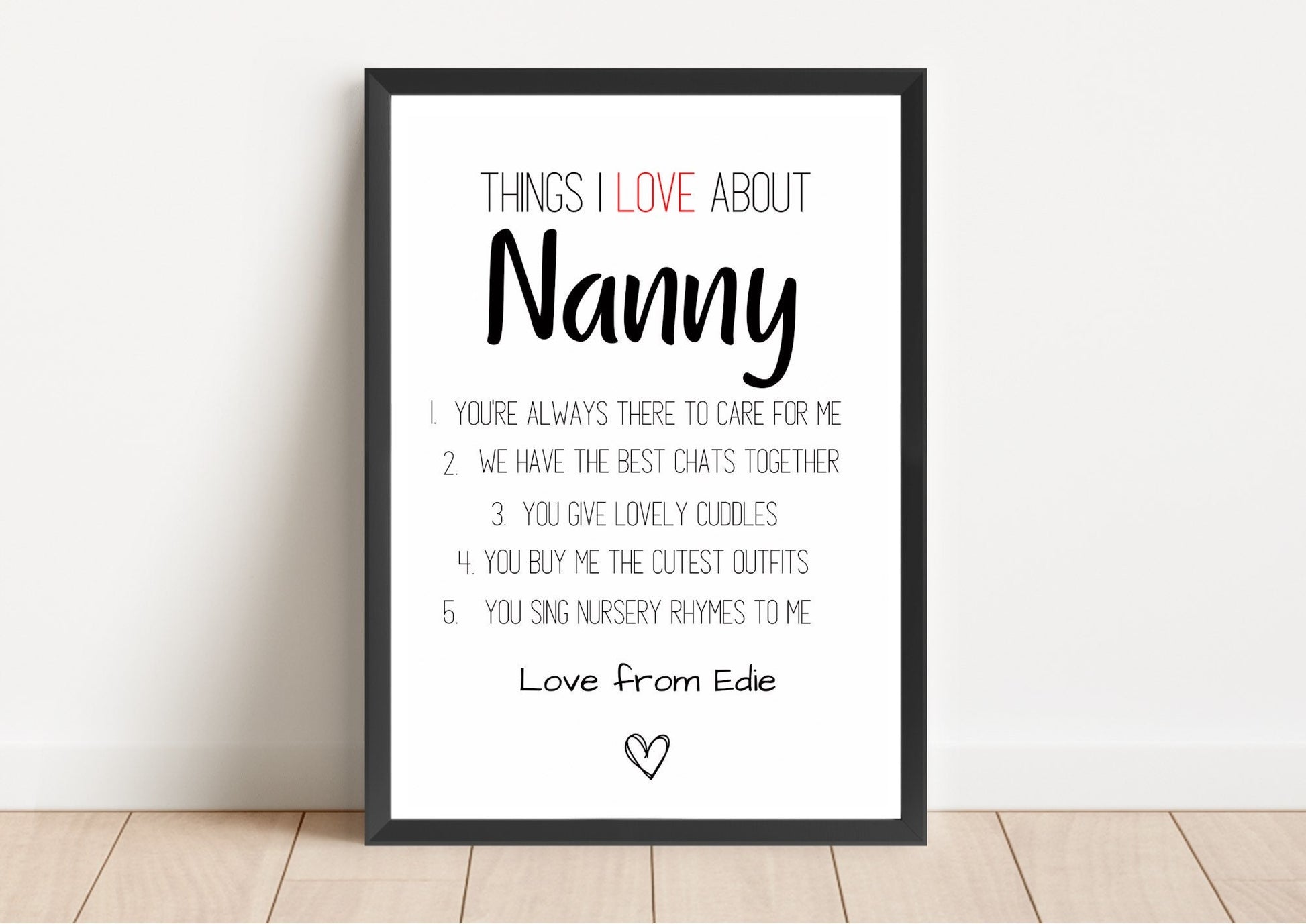 We all know Nana is famously hard to buy for. This is where we come in. This print is designed to be incredibly unique to you and the relationship you have with Nan, Nana, Nanny or Grandma. You can list up to 7 different reasons that she is special to you. 7 Reasons to put a big smile on Nans Face. There truly is no relationship quite like a relationship with your Grandparents so why now showcase that unique bond with this beautifully sentimental present from your little ones to their Nanny.