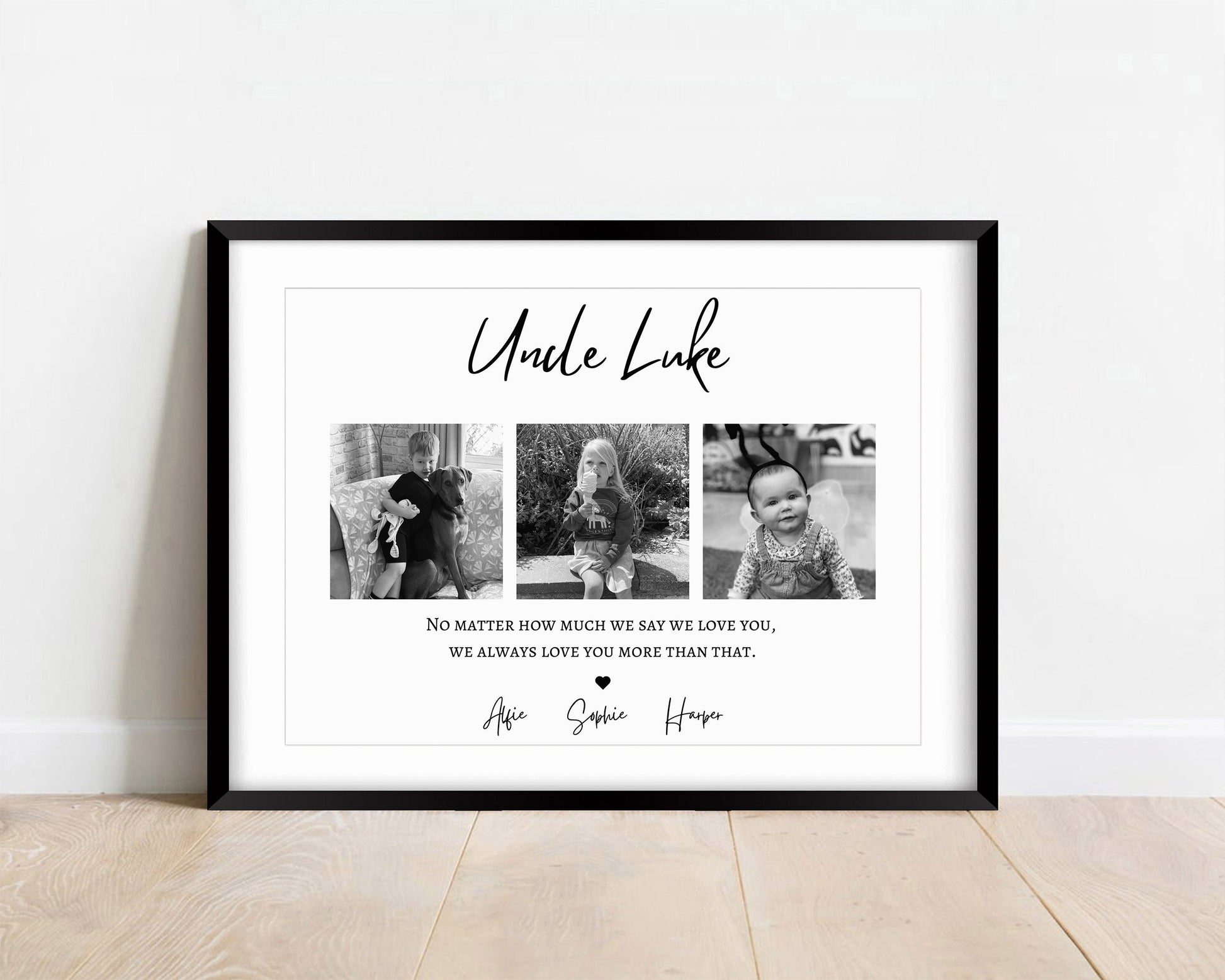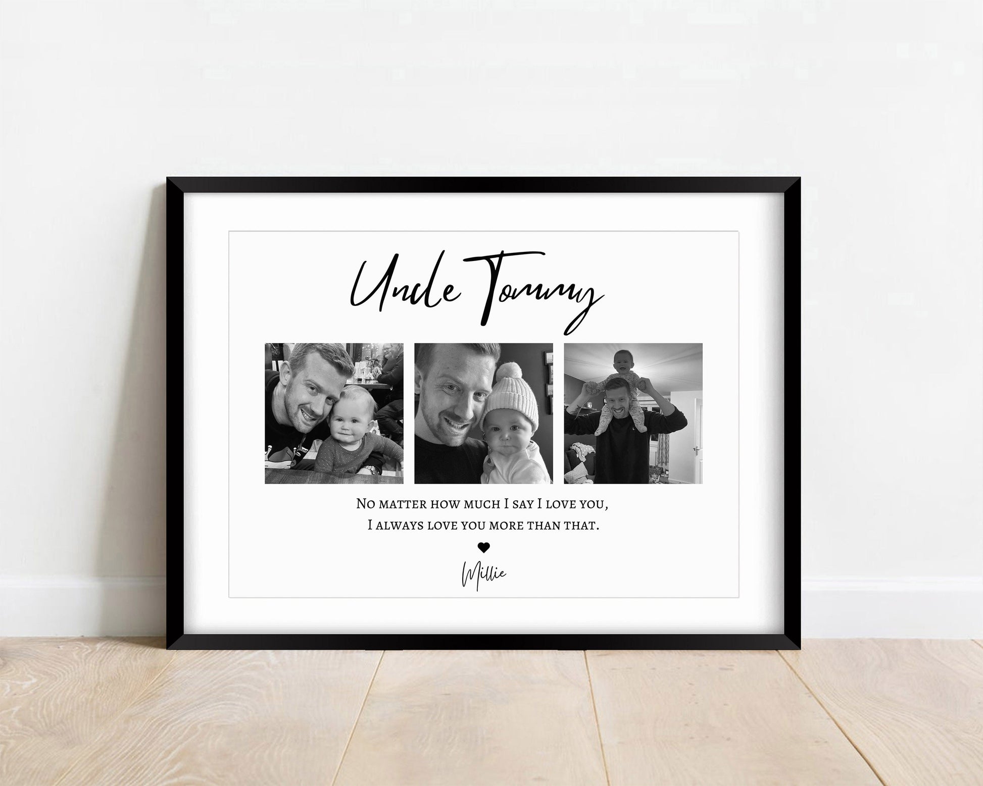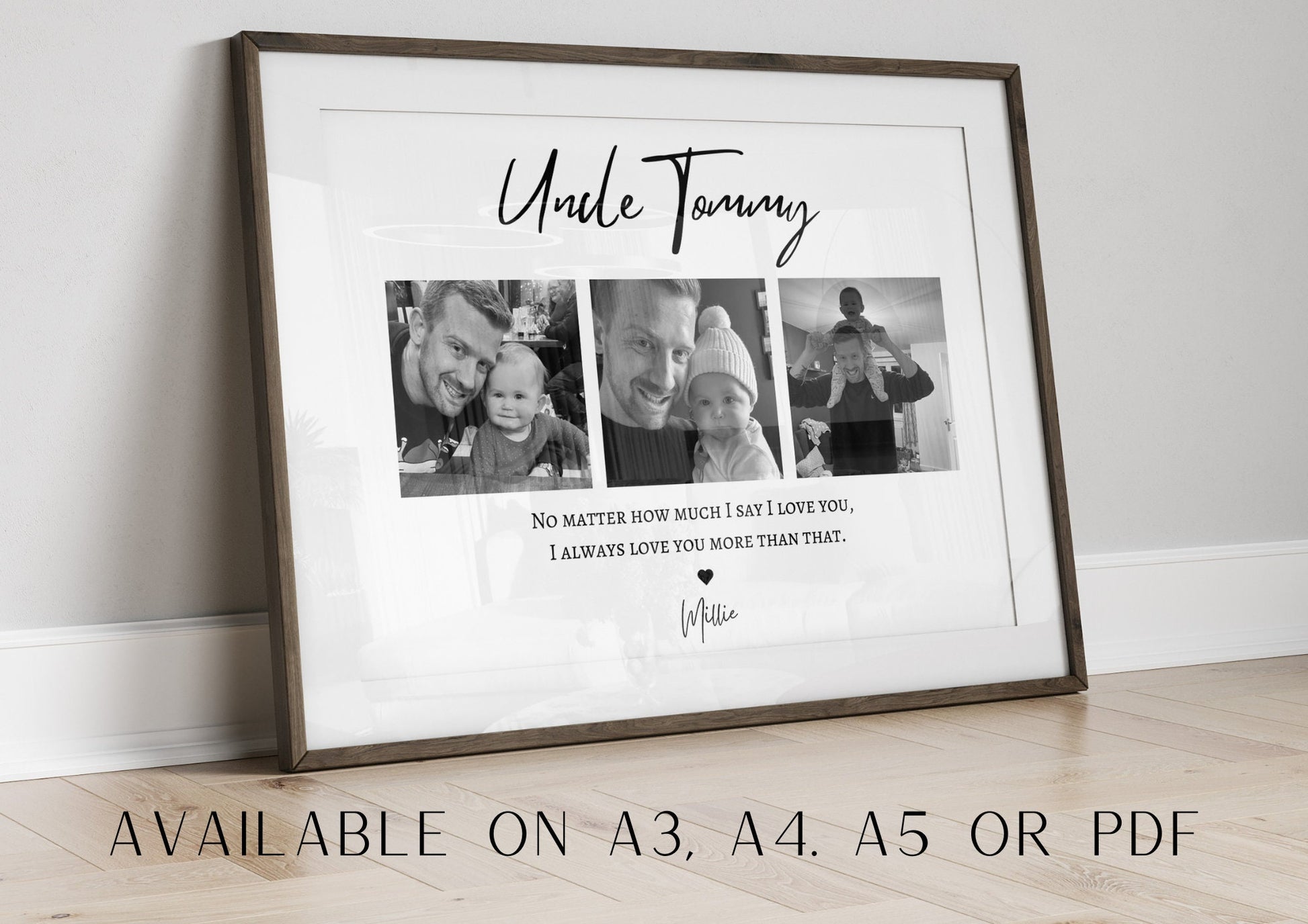Treat an incredible Uncle with this sentimental and beautiful customised photo print. Fully personalised to order with photos that capture the wonderful relationship with the Uncle name, the children/s name and a quote that reads 'No matter how much I/we say I/we love you, I/we always love you more than that.'