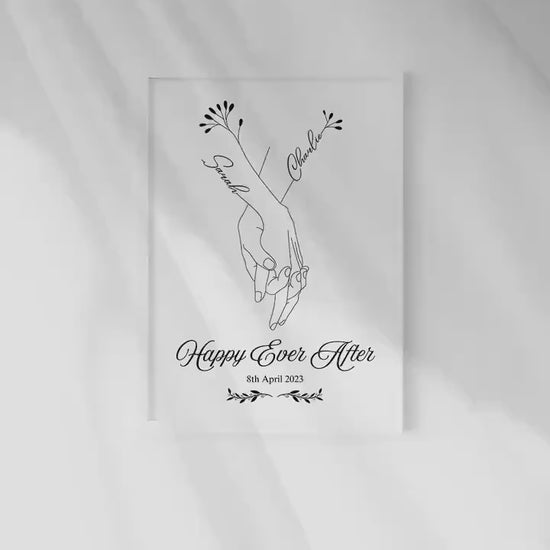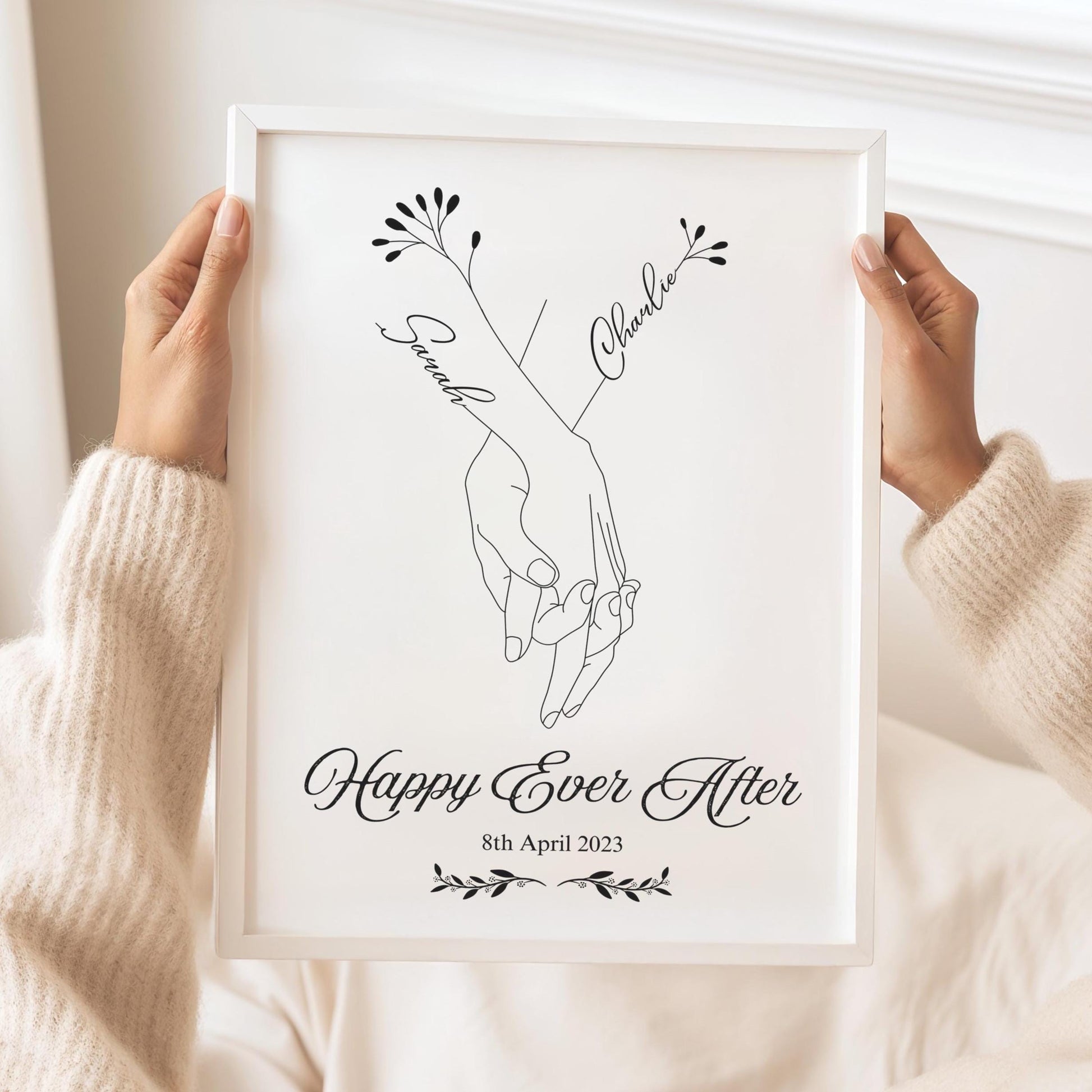 Celebrate love with this elegant, personalised wedding print featuring a minimalist line art drawing of two hands holding. Customise it with the names of the couple and a special date to make a truly unique keepsake.