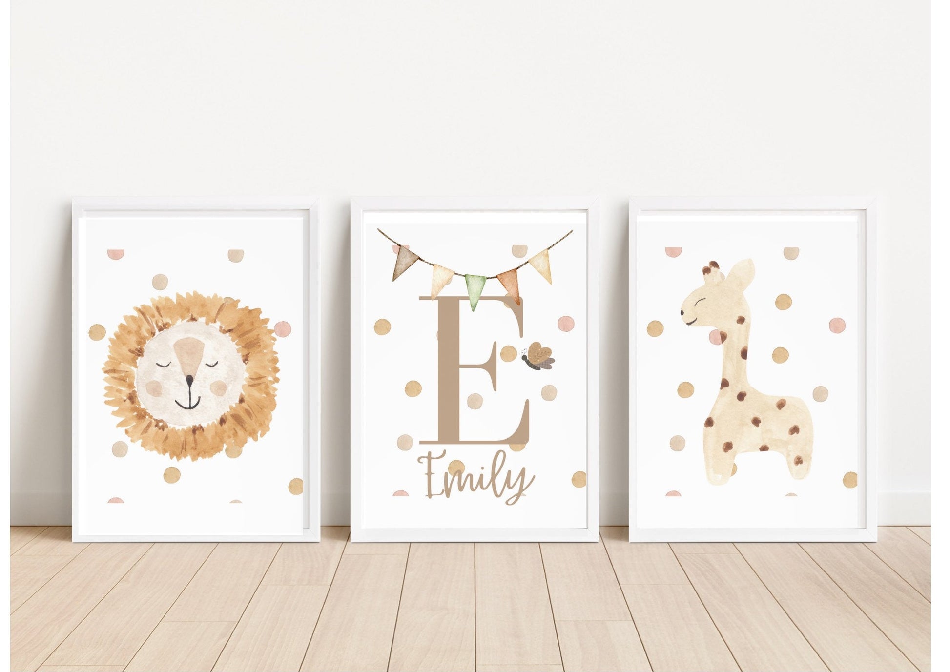 Boho Safari Set of 3 Nursery Prints, Perfect for your neutral bedroom spaces, personalised to order with both first name and initial of the recipient and delivered with free delivery anywhere within the UK.
