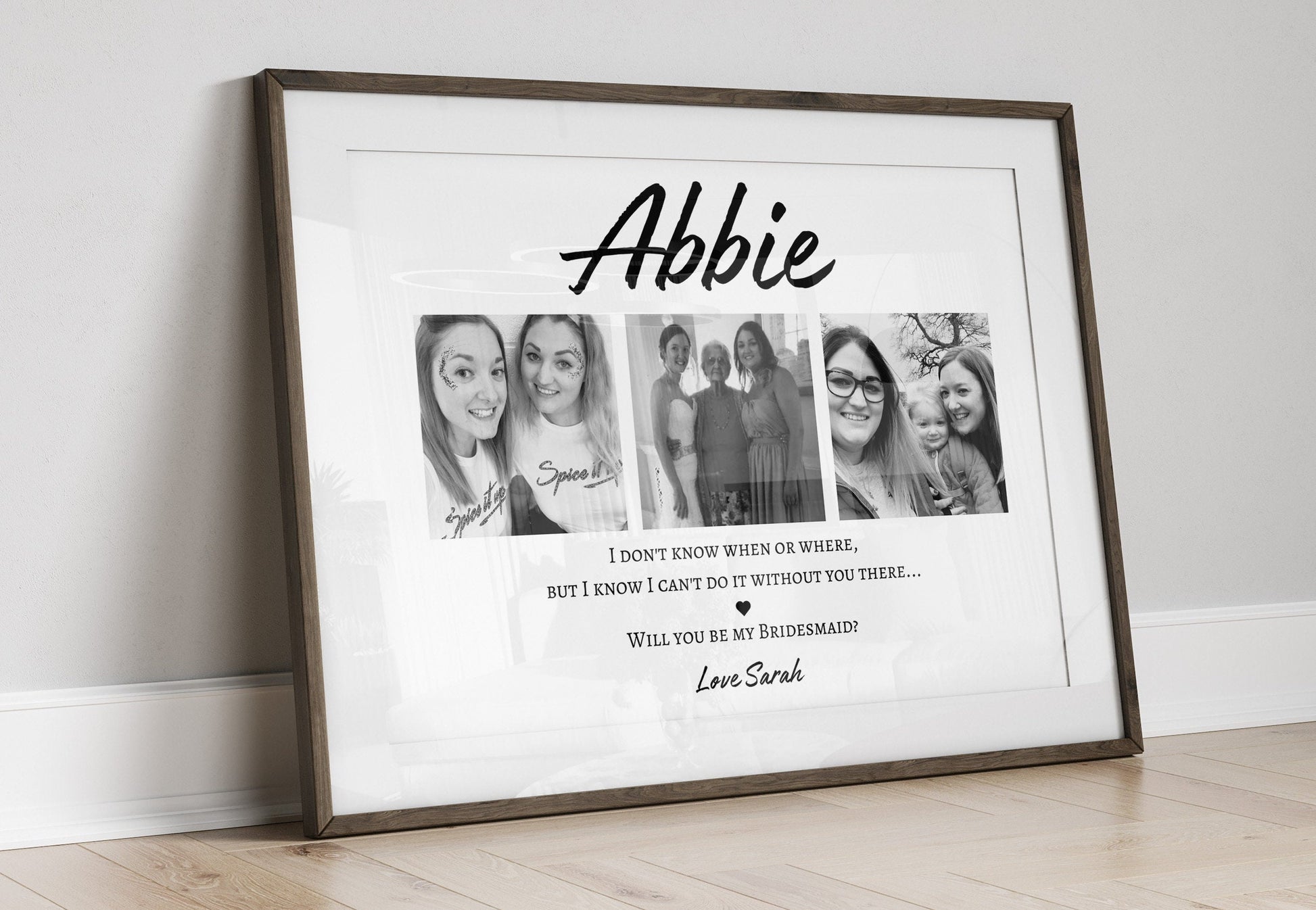 This beautiful minimalist style Bridesmaid proposal print is a stunning way to ask the big question to your nearest and dearest for your wedding day. Once ordered we will personalise your design with the individuals name, 3 photos of your choice which can be colour or black and white and the name of the bride to be at the bottom. With a quote that reads 'I don't know when or where, but I know I can't do it without you there. Will you be my Bridesmaid?'